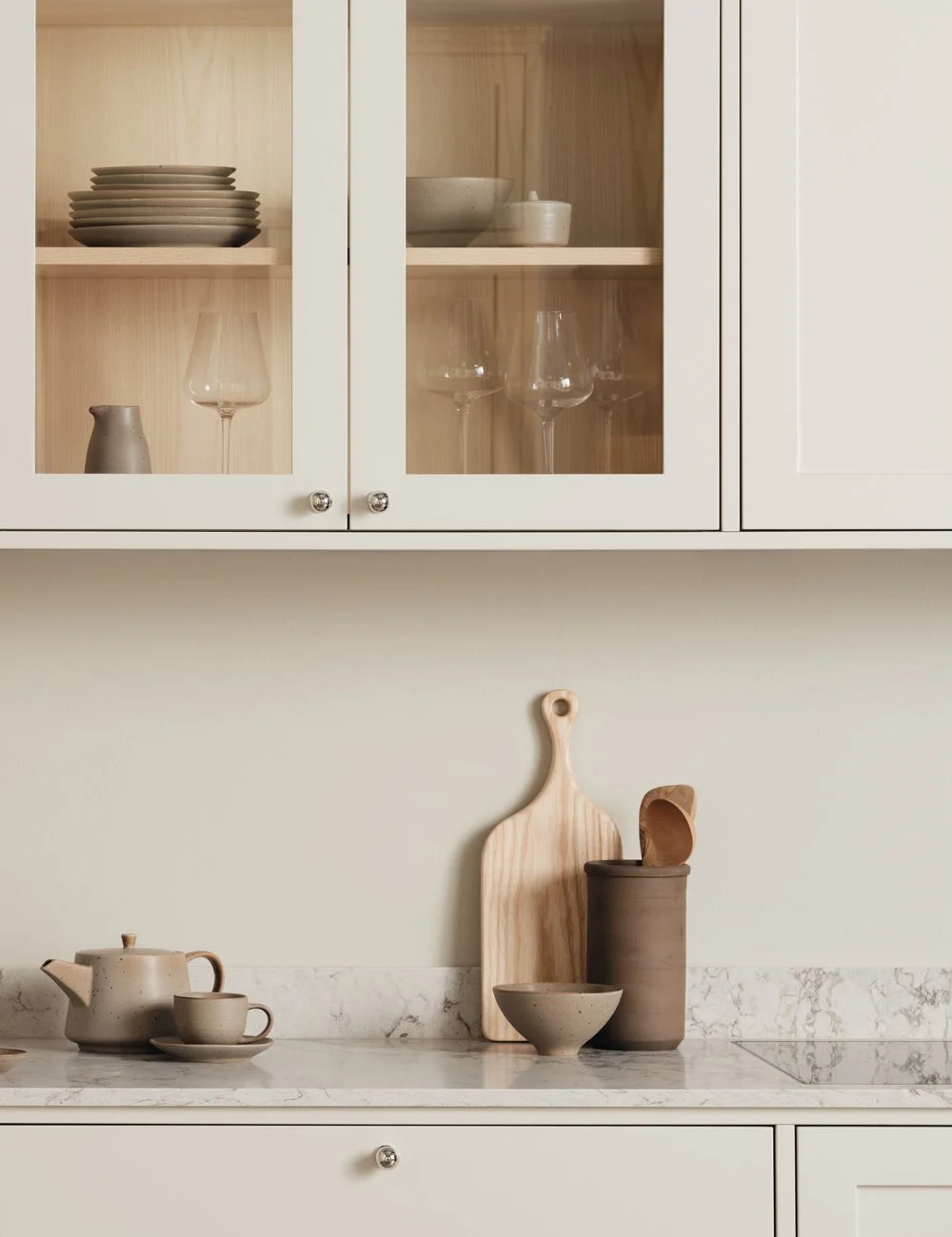 Den slitstarka och vackra kompositbänkskivan Moorland Fog från Caesarstone kompletterar den lugna beige färgskalan i köket.