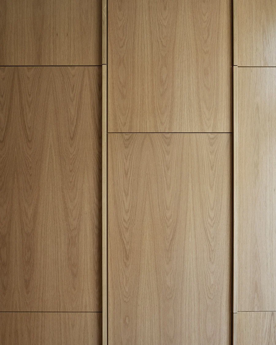 Luckorna på överskåp och bänkskåp är minimalistiska, utan ram. Den vackra ådringen i träet räcker som utsmycknad. Högskåpen närmast balkongdörrarna har däremot ramar mellan sig. På så sätt skapar man ett naturligt avbrott mellan de två delarna samtidigt som det gör att man slipper beslag, eftersom det finns infrästa grepp i ramarna.