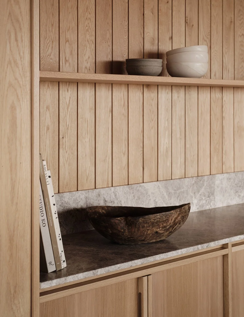 Den inbyggda förvaringsmöbeln blir en naturlig förlängning av köket. Kalkstenen återkommer på väggen och skapar en röd tråd i designen.