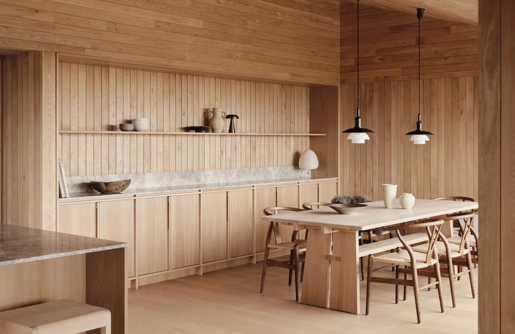 Köket i ljus ek är designat för att bli en naturlig del av arkitekturen. De rena linjerna, exakta proportionerna och materialvalen – ek och ljus kalksten – ger ett uttryck som känns både tidlöst och modernt. Med väggar, tak och golv i samma träslag skapas en varm och enhetlig känsla.
