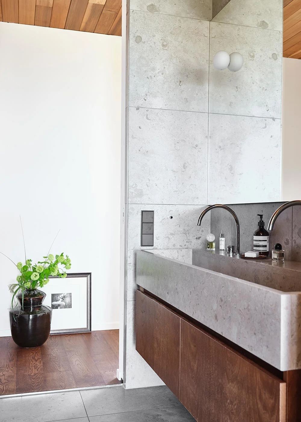 Den röda tråden i husets materialval är märkbart påfallande – badrummets kommod, även den från Nordiska Kök, går i samma ton som köket med mörkbetsad ek och kalksten. Sovrummet går i samma lugna färgskala även om den gula tonen är något mer framträdande i sovrummet.