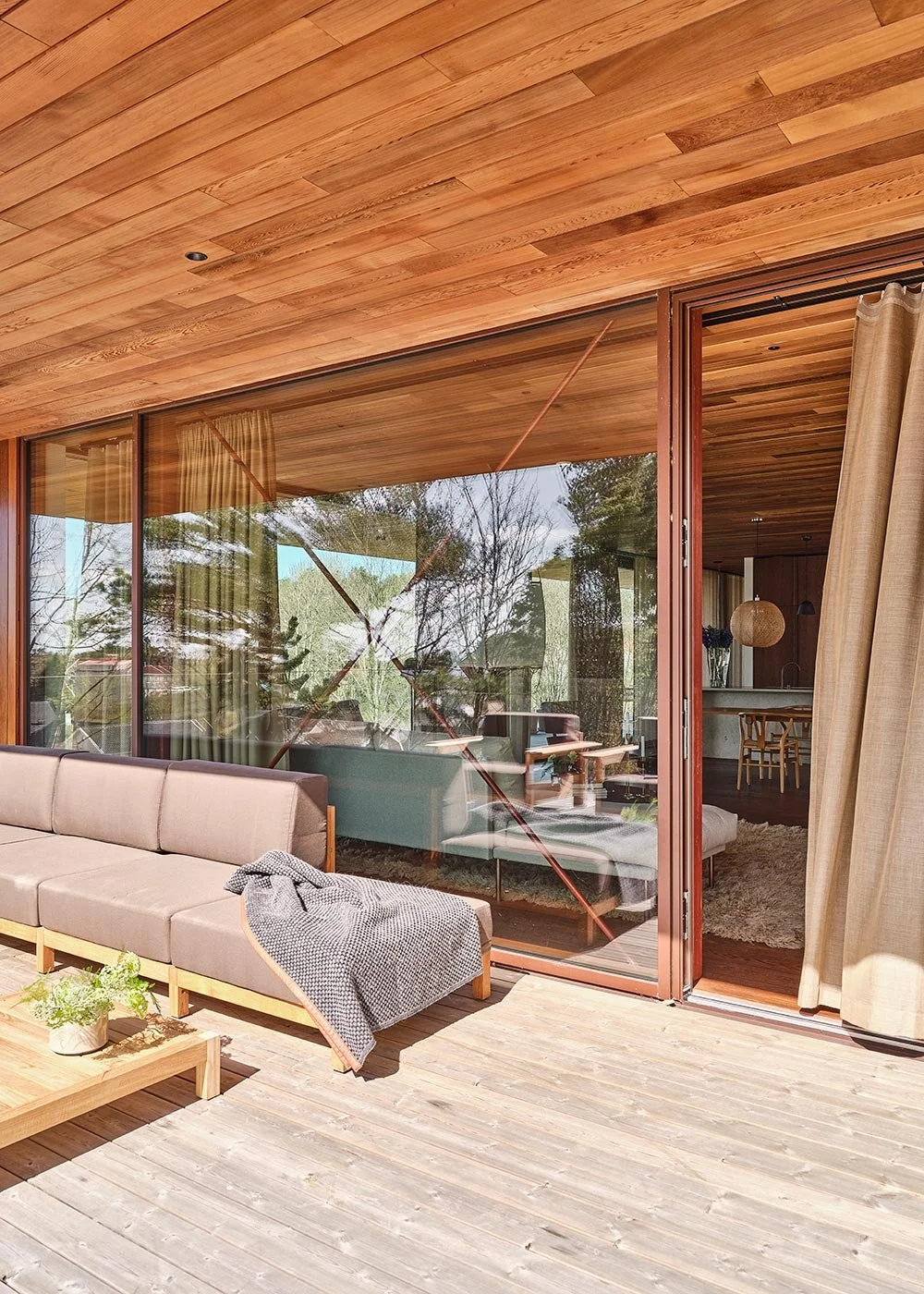 Färgskalan fortsätter även utomhus där trä är det mest dominanta materialet. Gränsen mellan inne och ute suddas ut, precis som Henrik planerat.