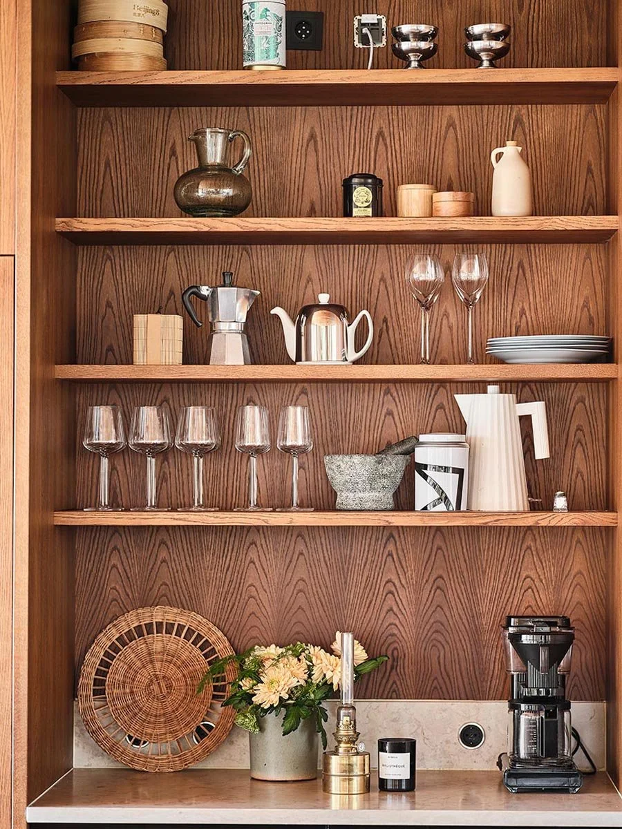 Det platsbyggda köket huserar både mycket förvaring och sociala ytor samt en öppen hyllösning där kaffestation och vackert porslin visas upp. Henrik och Linas känsla för inredning syns tydligt i möblemanget och designermöbler som Hans J. wegners klassiska Y-stol återkommer i inredningen likväl som Charles and Ray Eames klassiska fotölj Lounge chair.