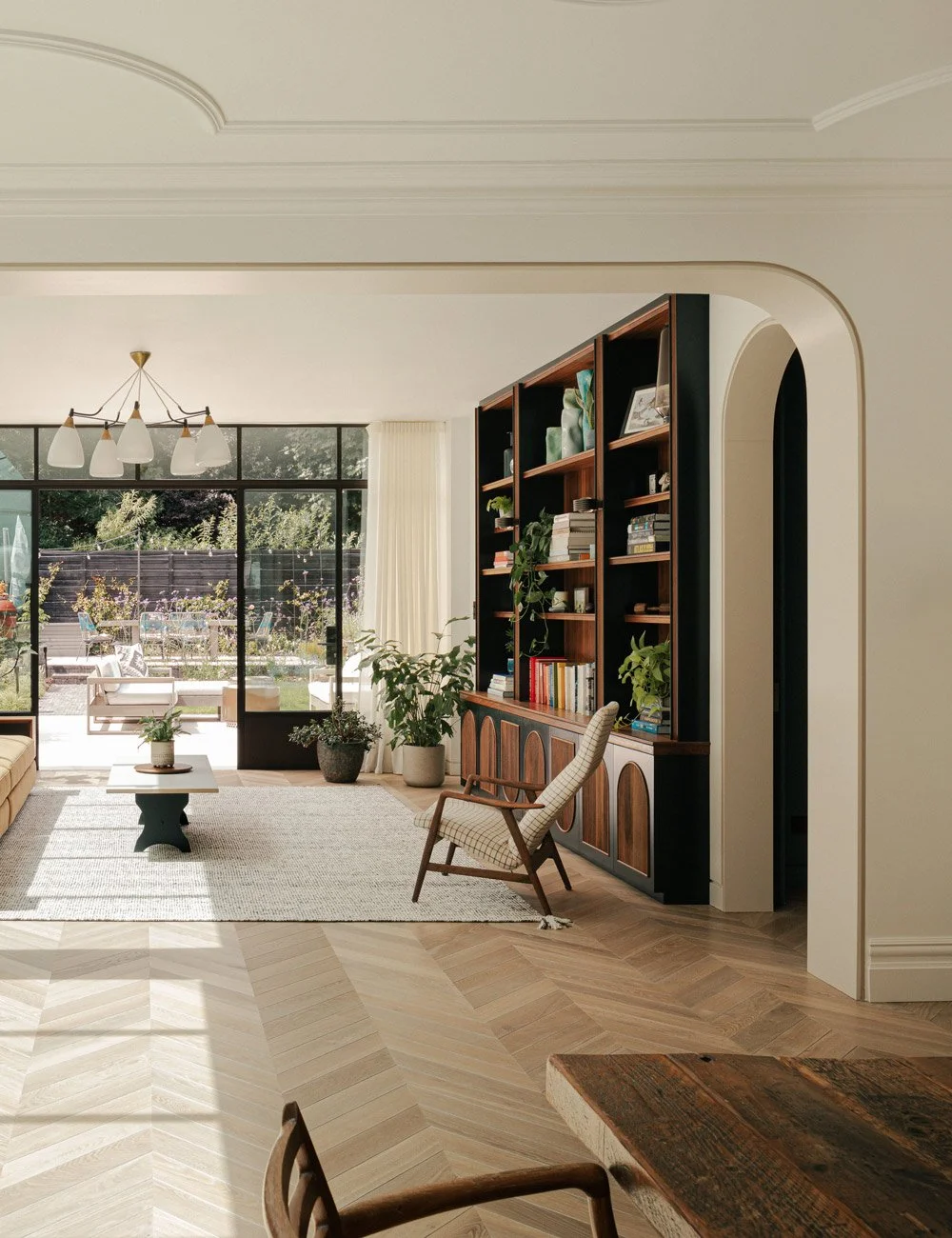 Välvda bågformade detaljer är genomgående i hemmet och förstärker den geometriska estetiken som är utmärkande för art deco.