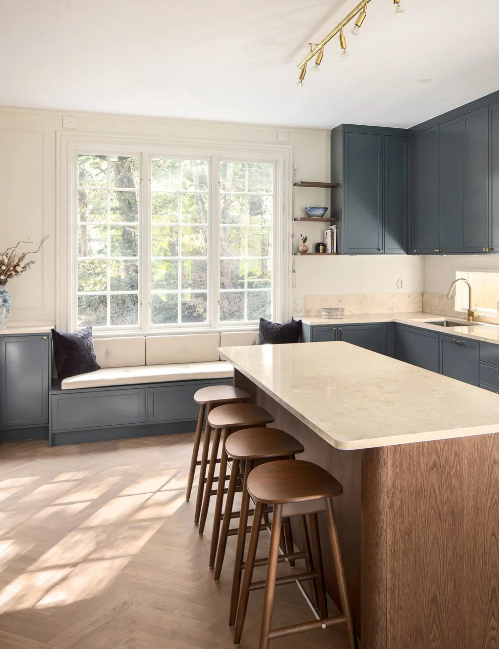 Nedanför det generösa fönstret med spröjs finns den klassiska sittbänken, perfekt att krypa upp i för en morgonkopp. Den vackra köksön i mörk ek blir som en masterpiece i köket. En samlingspunkt för familjen eller för gästerna som kommer på besök.