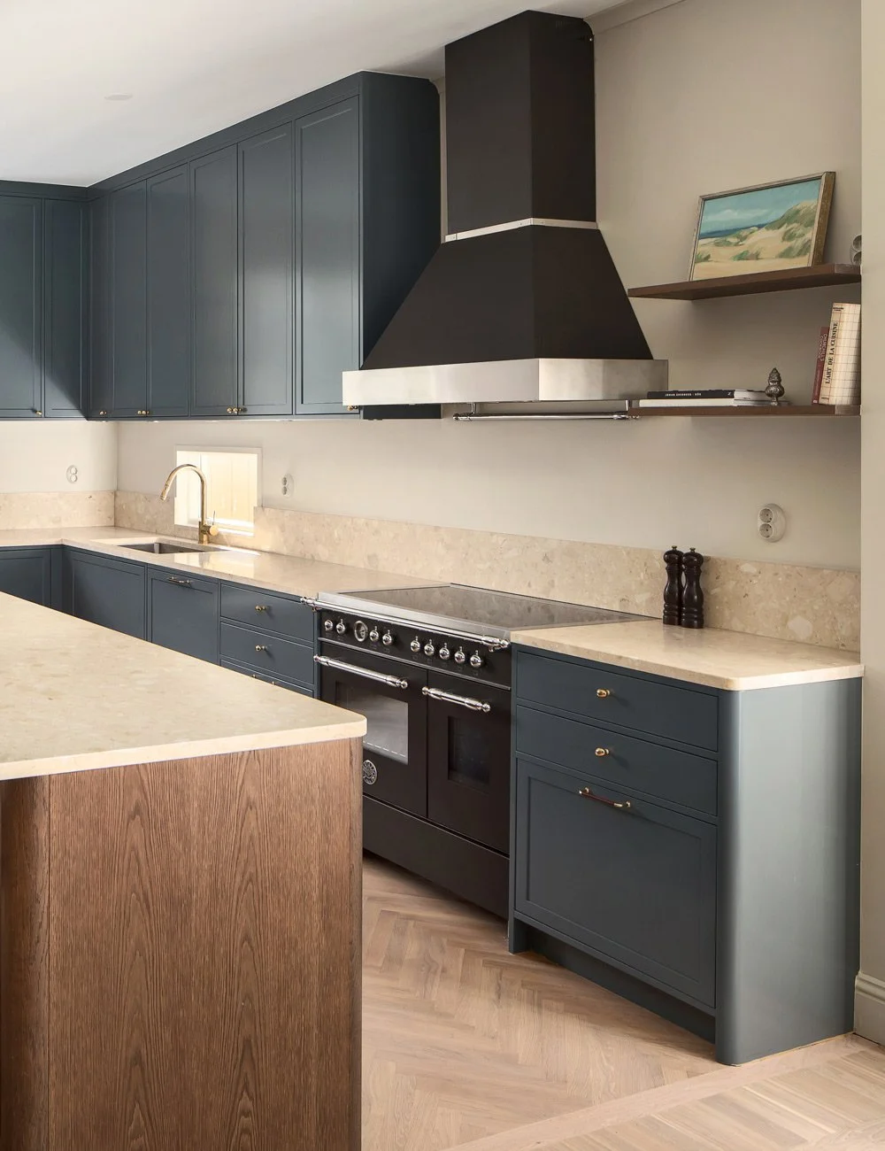 Blått lantkök med svart spis och fläkt från Bertazzoni.