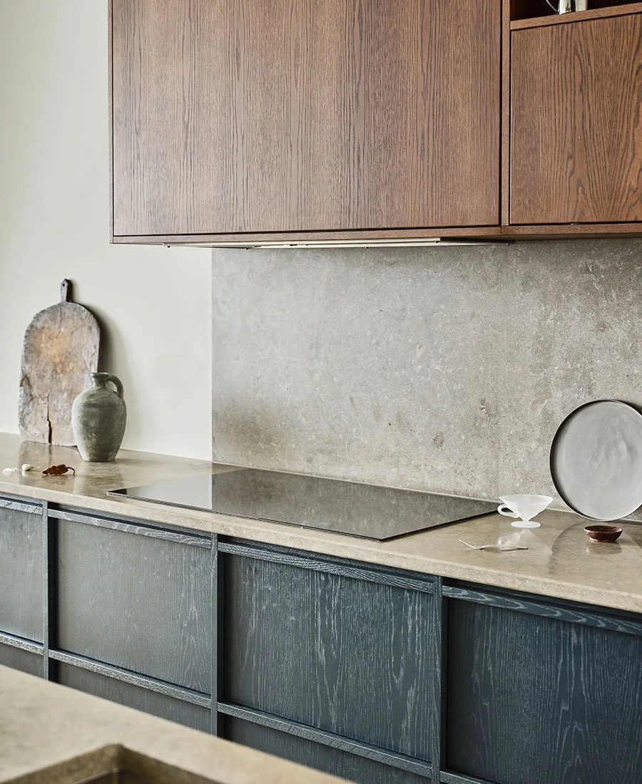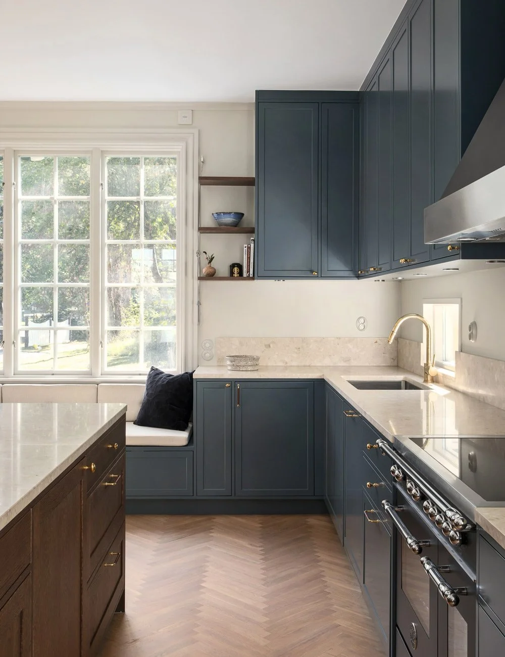 Azul Valverde-kalkstenen ger en vacker kontrast till de mörkblå luckorna.