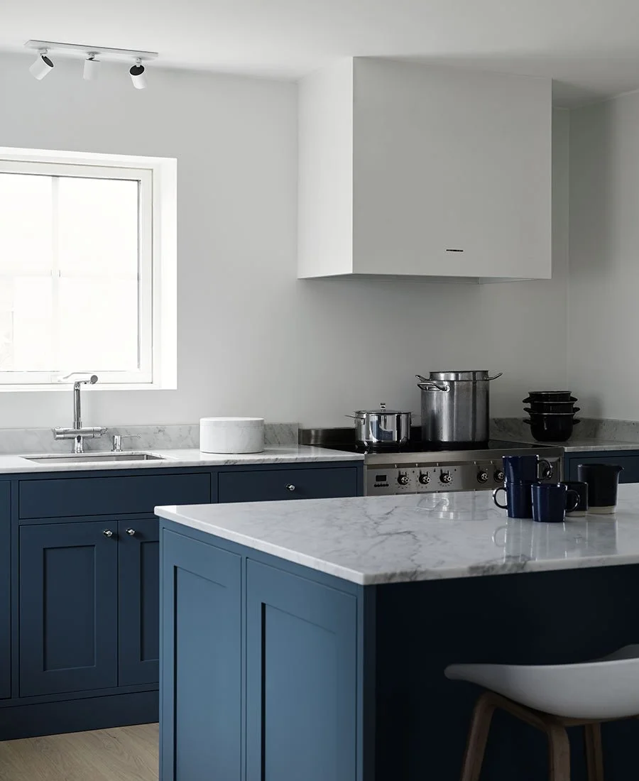 Den ljusa bänkskivan i marmor ger det blå köket en exklusiv känsla.