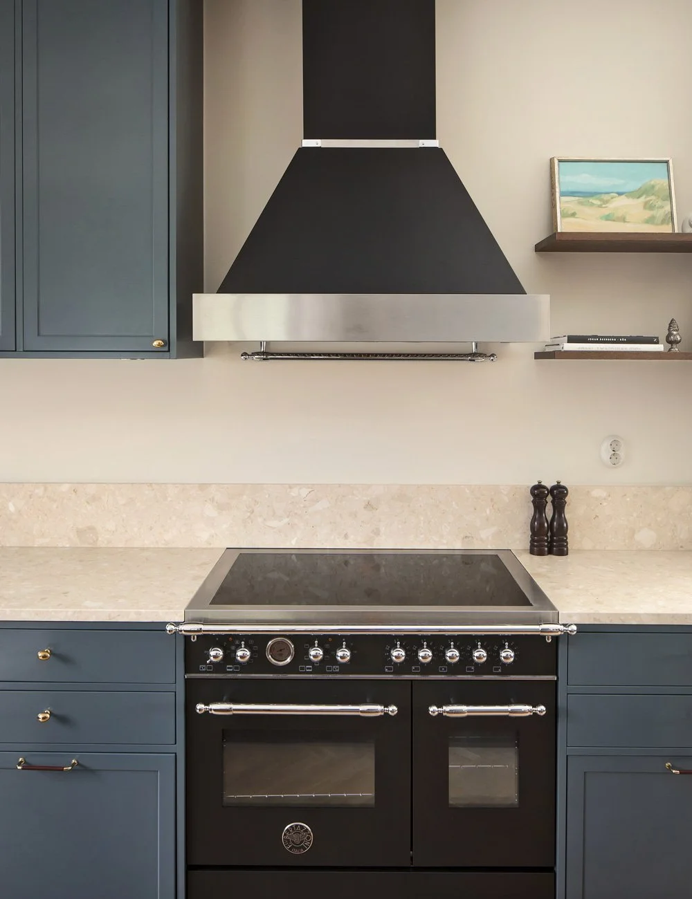 Elegant blått lantligt kök i mörkblå ton med klassiska detaljer i mässing och krom. Spis och fläkt från Bertazzoni. Foto: Kronfoto