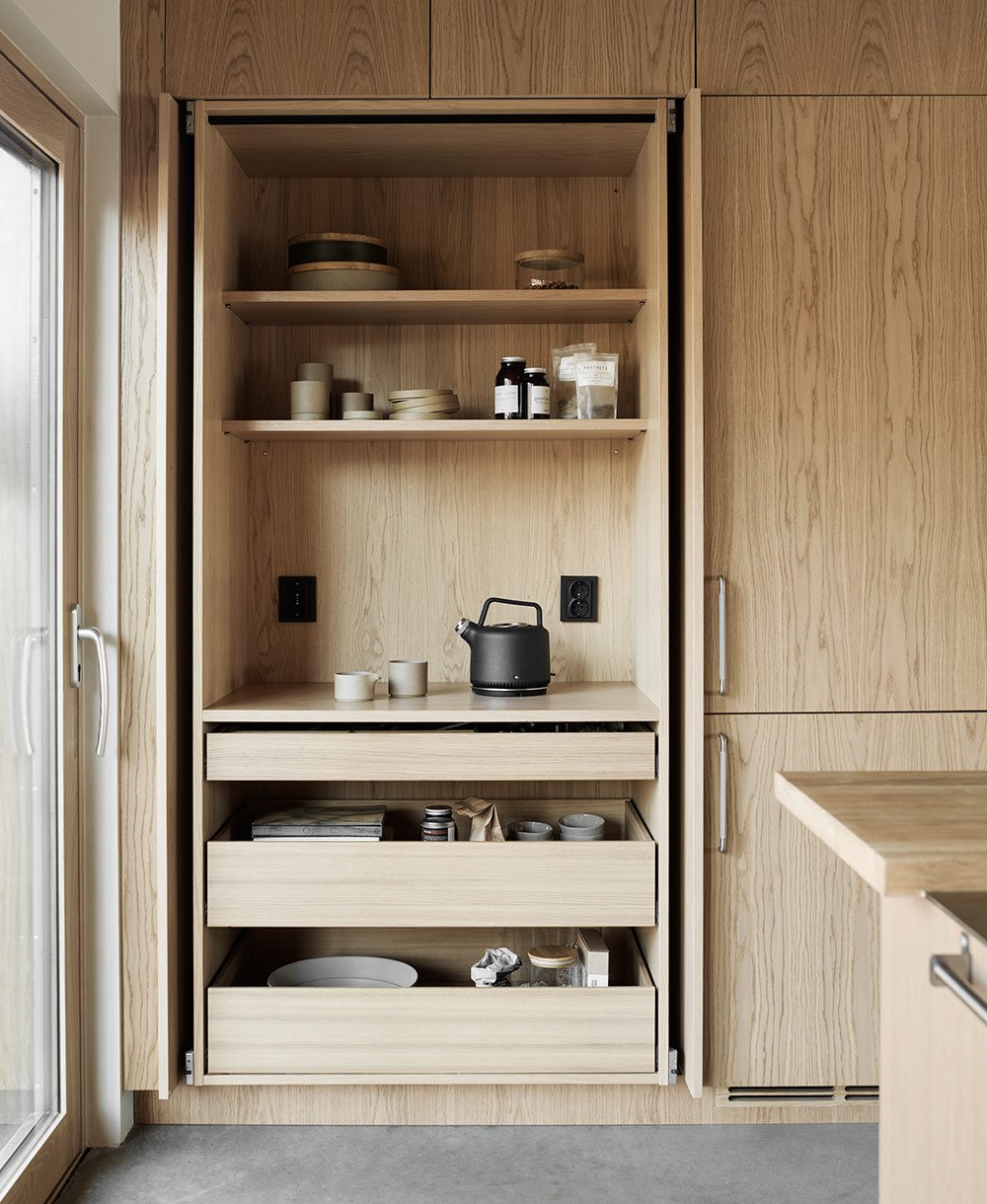 Shakerkök i vitpigmenterad massiv ek för Xiao He, grundare av arkitektstudion Studio He till hennes underbara hus i Nynäshamns skärgård.