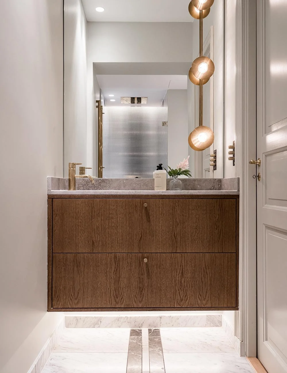 Även badrumskommoden är platsbyggd från Nordiska Kök. Betsad i samma nyans som köket för att få en röd tråd i färg och materialvalen i lägenheten.