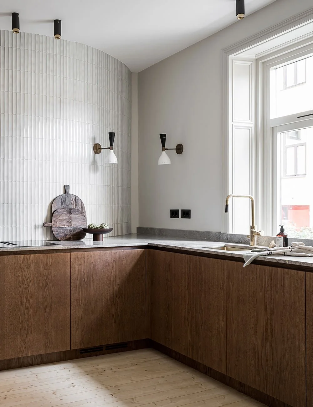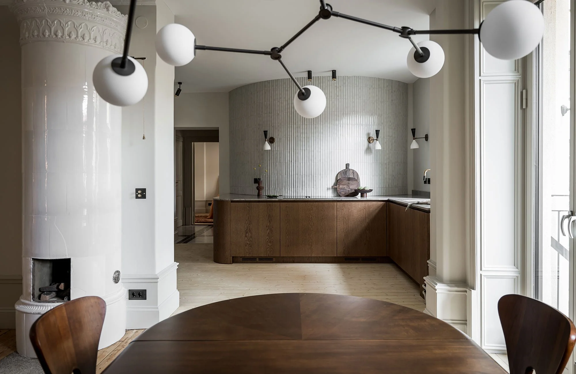“Vi är väldigt glada att vi valde att gå på vår initiala magkänsla och klä in den runda väggen i kakel. Det, tillsammans med det vackra träköket i betsad ek från Nordiska Kök förstärkte rummets karaktär och resulterade i ett unikt och modernt kök”