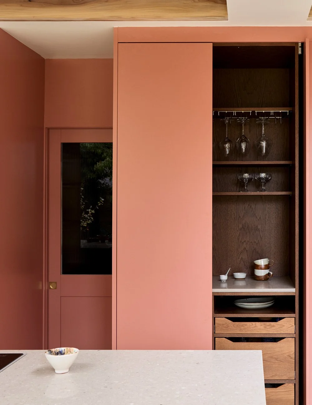 Bakom det smarta pocket-door skåpet finns även ett skafferi dolt bakom en dörr, målad i samma kulör som övriga köket.