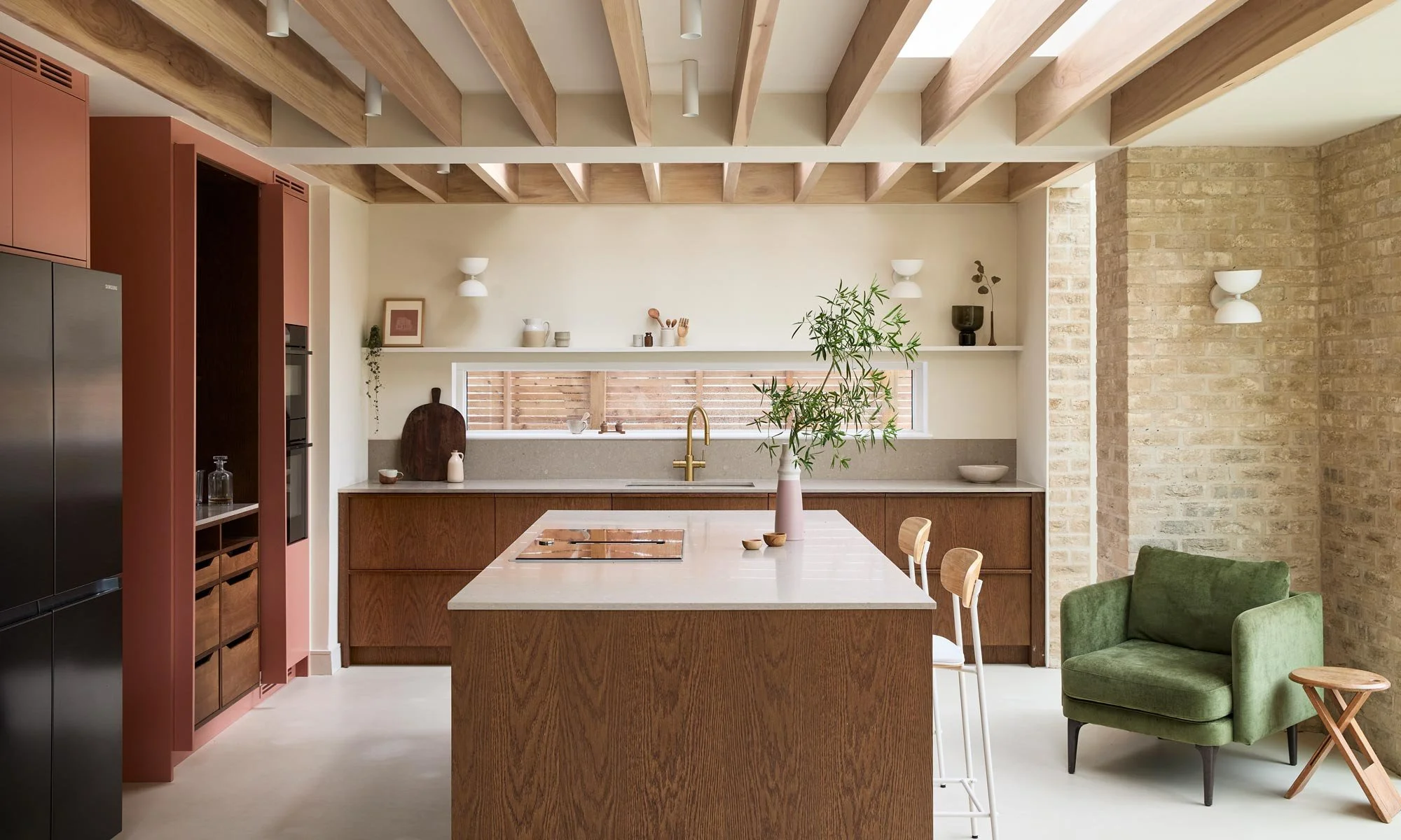 Det gamla uterummet som vette mot bakgården byttes ut mot en ny utbyggnad som erbjuder en öppen planlösning med kök, matplats och vardagsrum. Vita valde att sätta upp stora glaspartier mot trädgården för att låta ljuset flöda in. Kökets skandinaviska design i mörk ek kontrasteras av en varmrosa nyans, vilket skapar både personlighet och karaktär. De vackra vitpigmenterade takbjälkarna och tegelstensväggen förhöjer känslan och kopplingen till originaldetaljerna samt husets ursprungliga arkitektoniska stil.