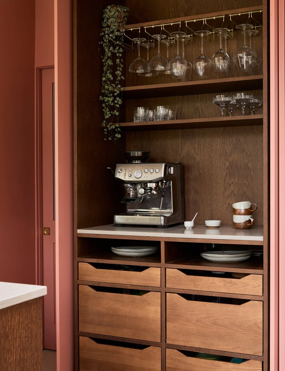 Den varmrosa nyansen ger köket en personlig prägel och kompletterar den mörka eken.