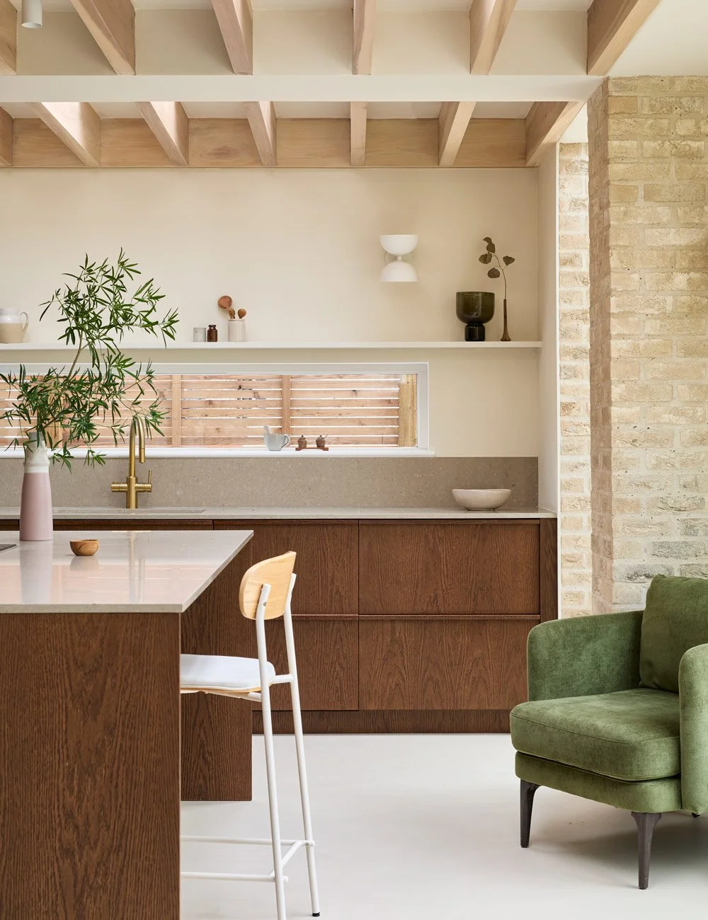 Det mörka träköket matchas med takbjälkar i vitpigmenterat trä och väggar av tegel.