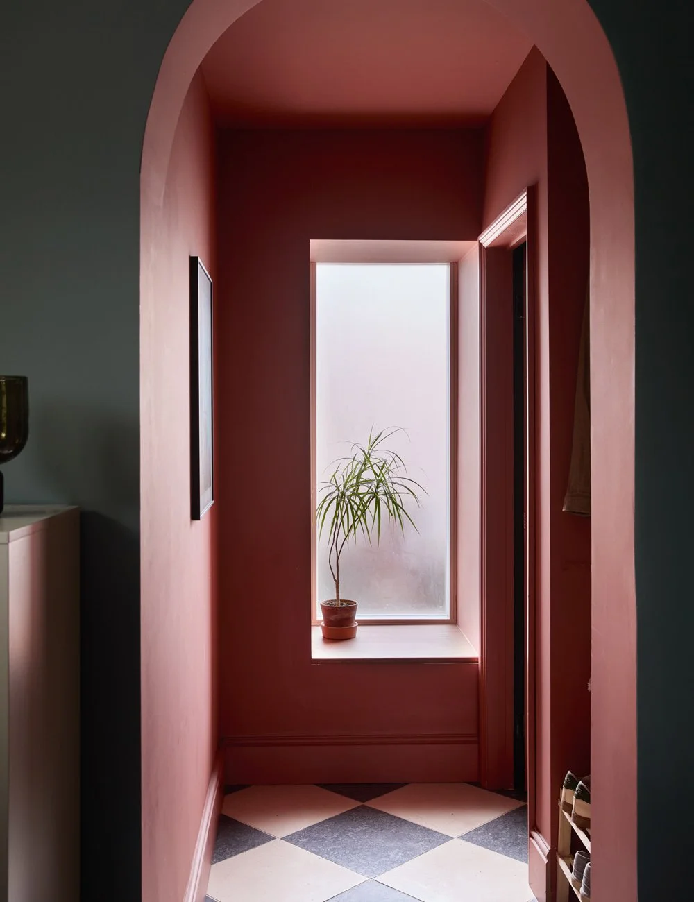 Den vackra passagen matchar kökets varma rosa färg och skapar ett unikt uttryck i huset.
