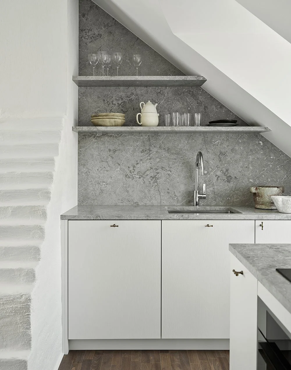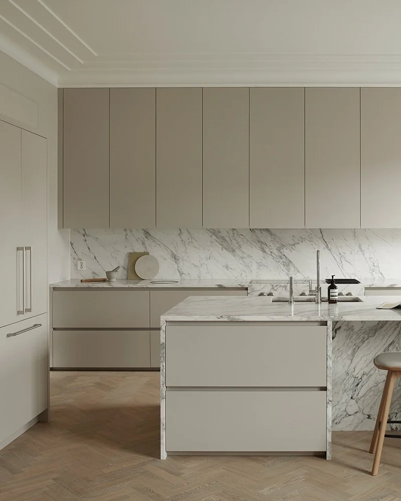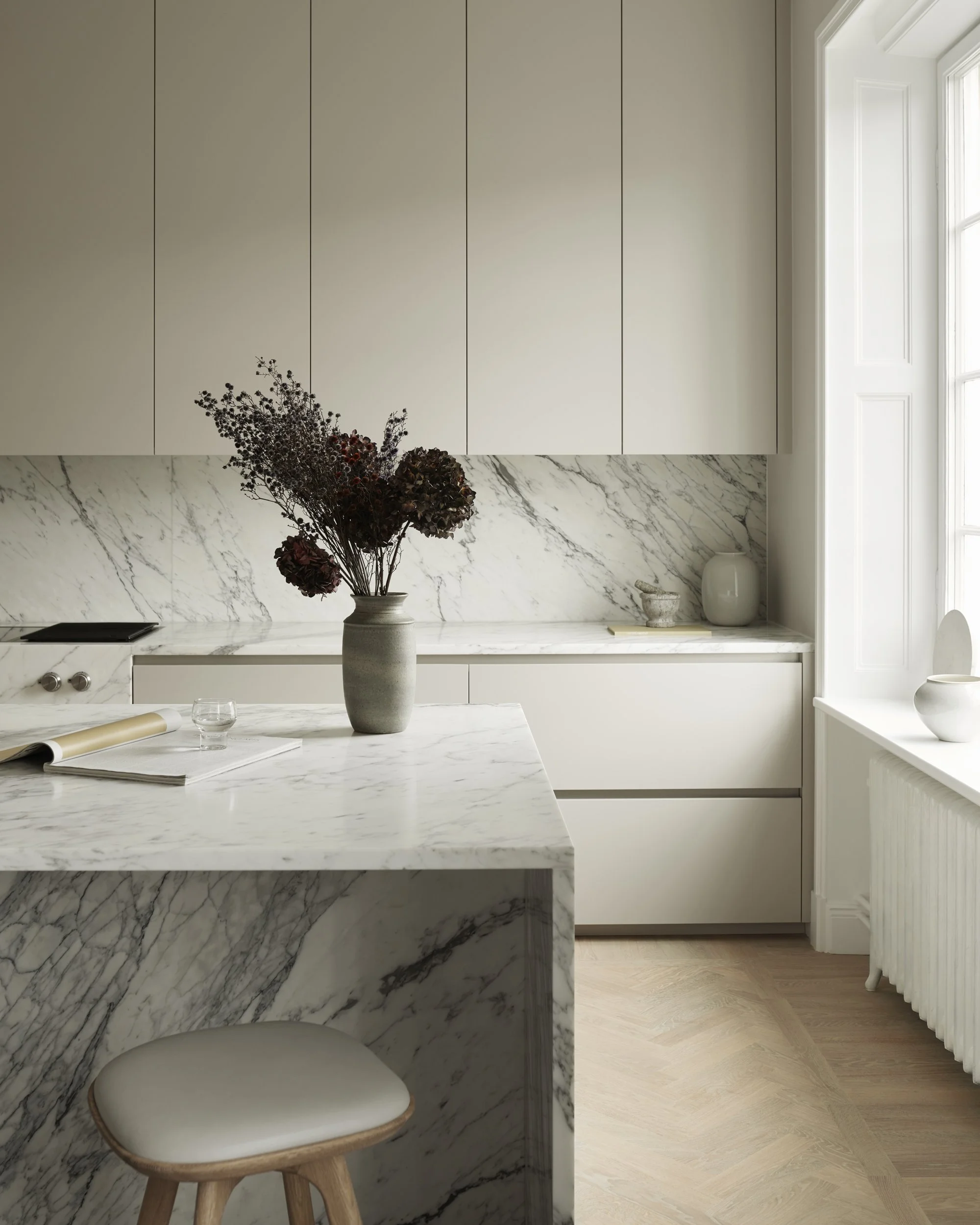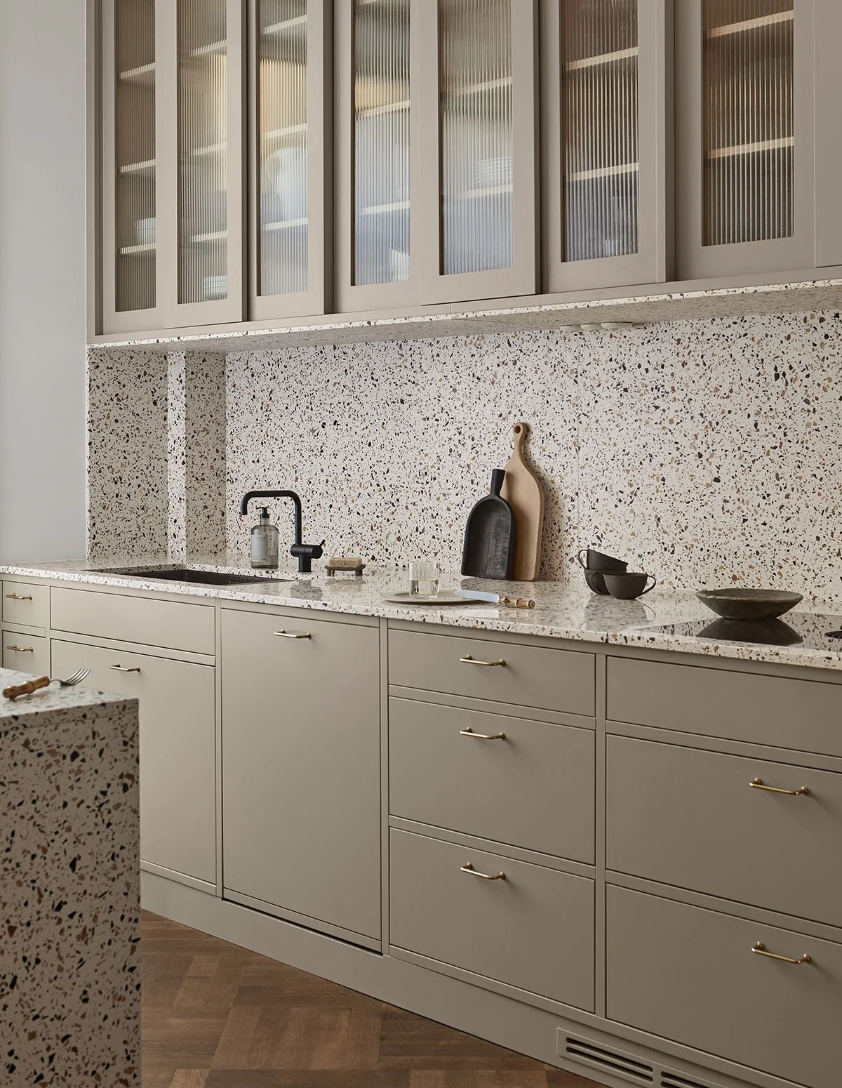 Tidlöst minimalistiskt kök med vacker Terrazzo-bänkskiva.