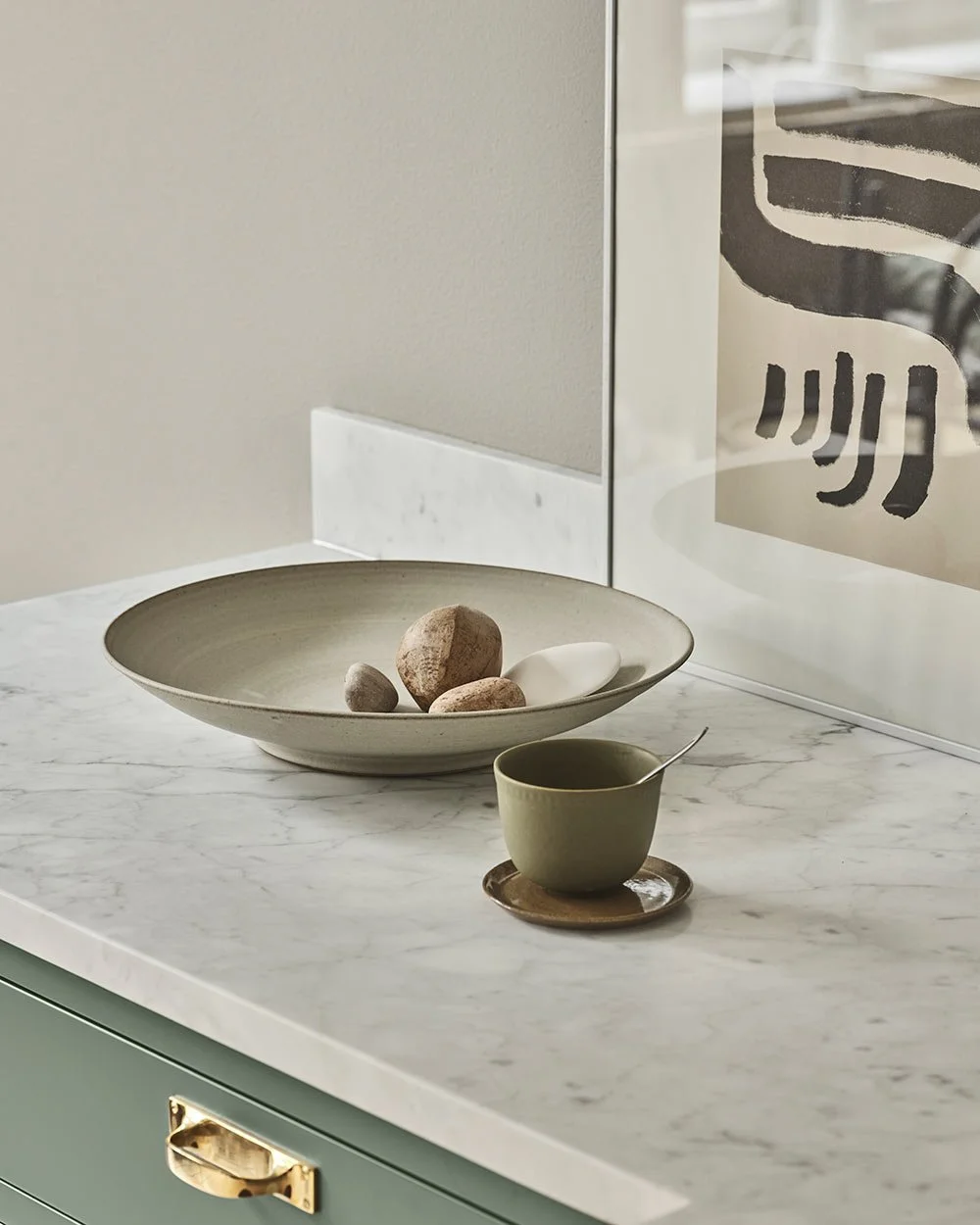För att bryta av det annars klassiska köket har matsalsbordet inretts med modern keramik i naturnära färger.