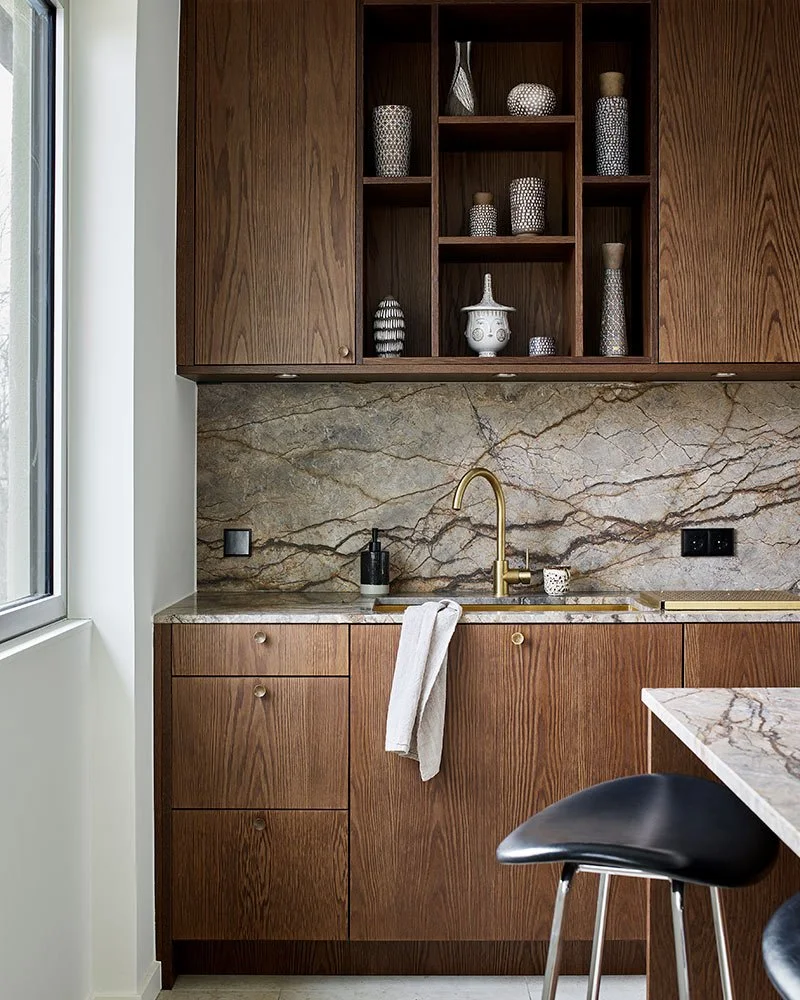 Mötet mellan trä och sten är centralt för detta kök. Den vackra kalkstenen, även den med inslag av brunt, som smakfullt bryter av det mörka träet och utöver dess kvaliteter adderar både trä och sten en tidlös känsla. Samtidigt kopplar materialen an till naturen, här med tydlig inspiration från träden och bergen som omger fastigheten.
