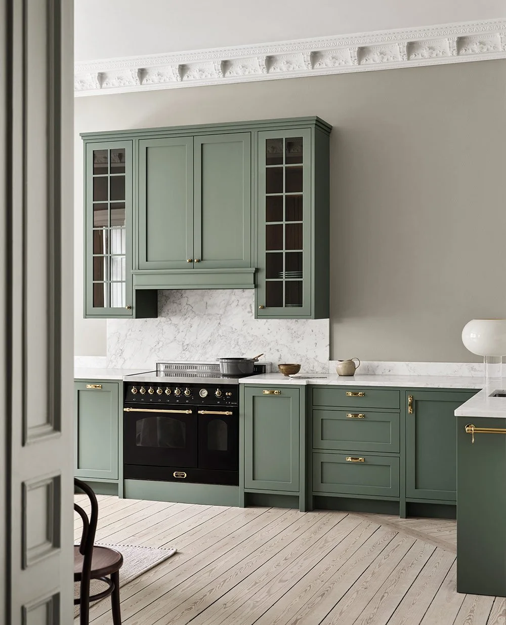 Lantköket i grönt med överskåp målat i vitt med vitringlas.