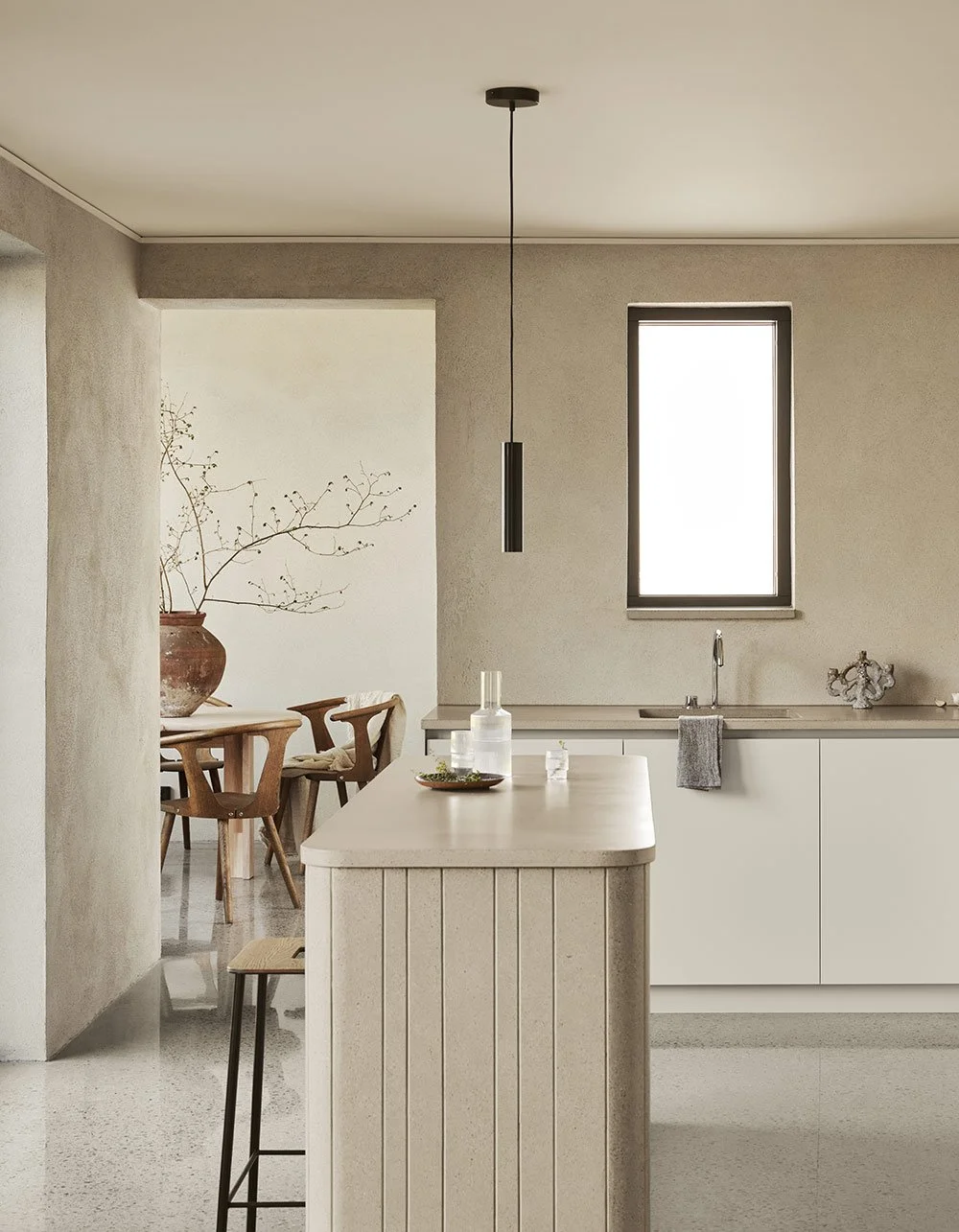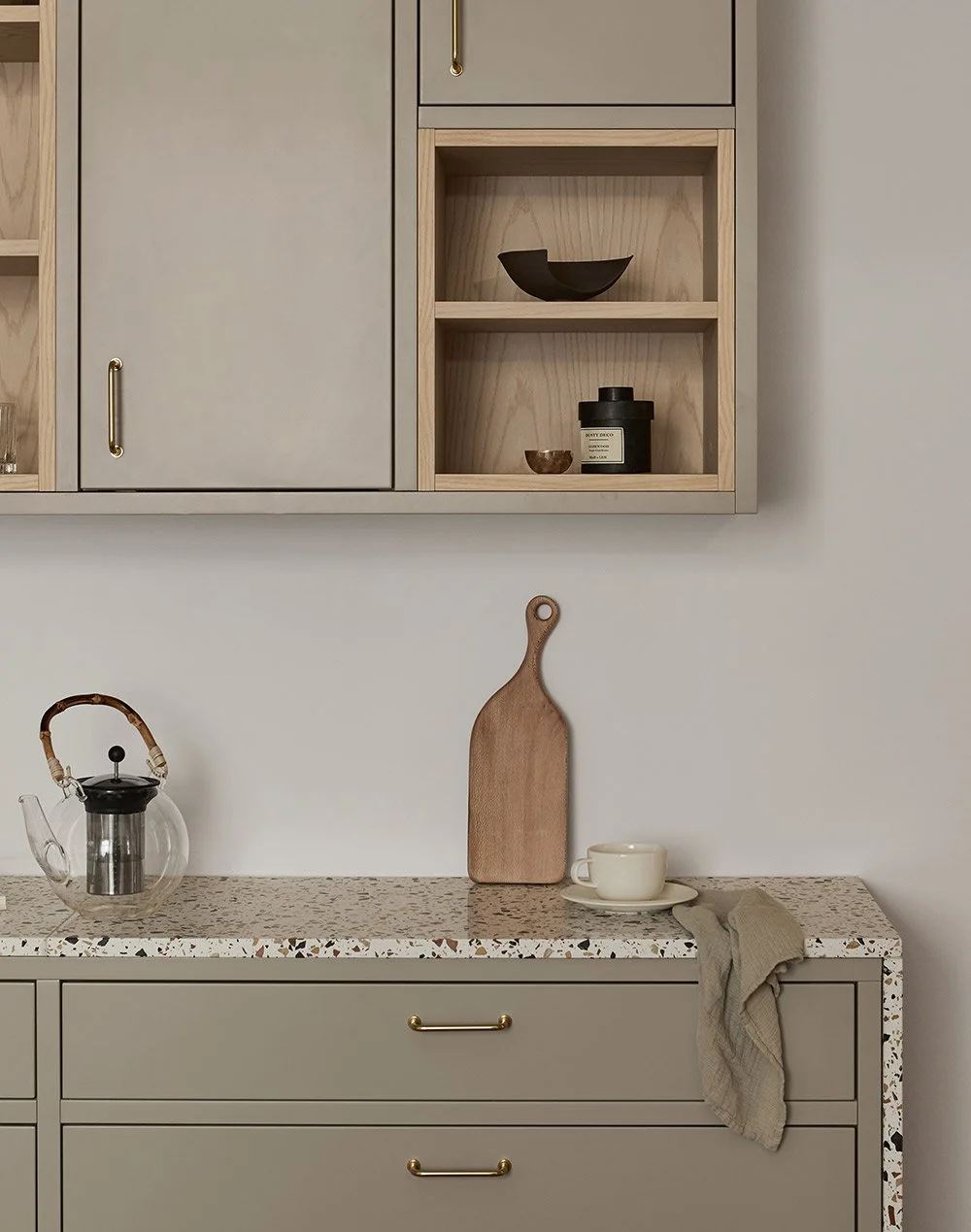 den varma grå tonen på detta kök kontrasteras av en livfull och flerfärgad Terrazzo.