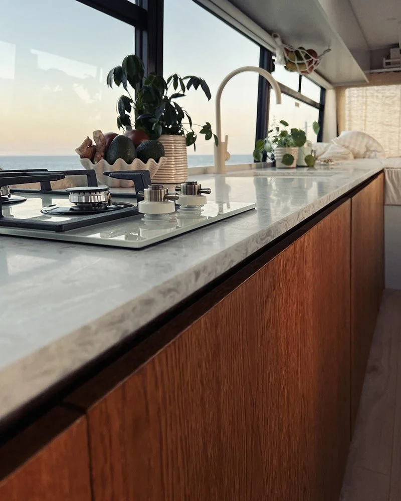 Köket har så mycket som gör att vi förälskar oss mer i det för varje dag som går. Kombinationen av det mörka träet mot den ljusa stenskivan, bänkskåpen som är otroligt vackra men också rymmer mer än vi någonsin kunde tro. Det är en estetisk och praktisk fullträff. Tack vare de smarta lösningarna från Nordiska Kök har vi fått till ett lika stort kök i vår skolbuss som vi hade i vår lägenhet i Stockholm.