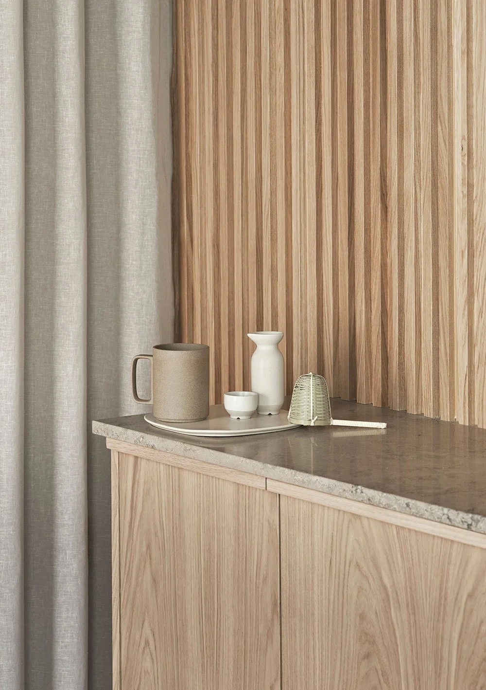 Helst ska köksbänk, luckor och väggar harmonisera med varandra för att skapa det där omhändertagande lugnet som vi så gärna vill ha. För att ytterligare addera ett element av natur så får materialen gärna ha taktila strukturer och organiska mönster. De få accessoarerna man hittar på köksbänken är handgjorda i keramik, metall och trä och eventuella växter är naturligt yviga.