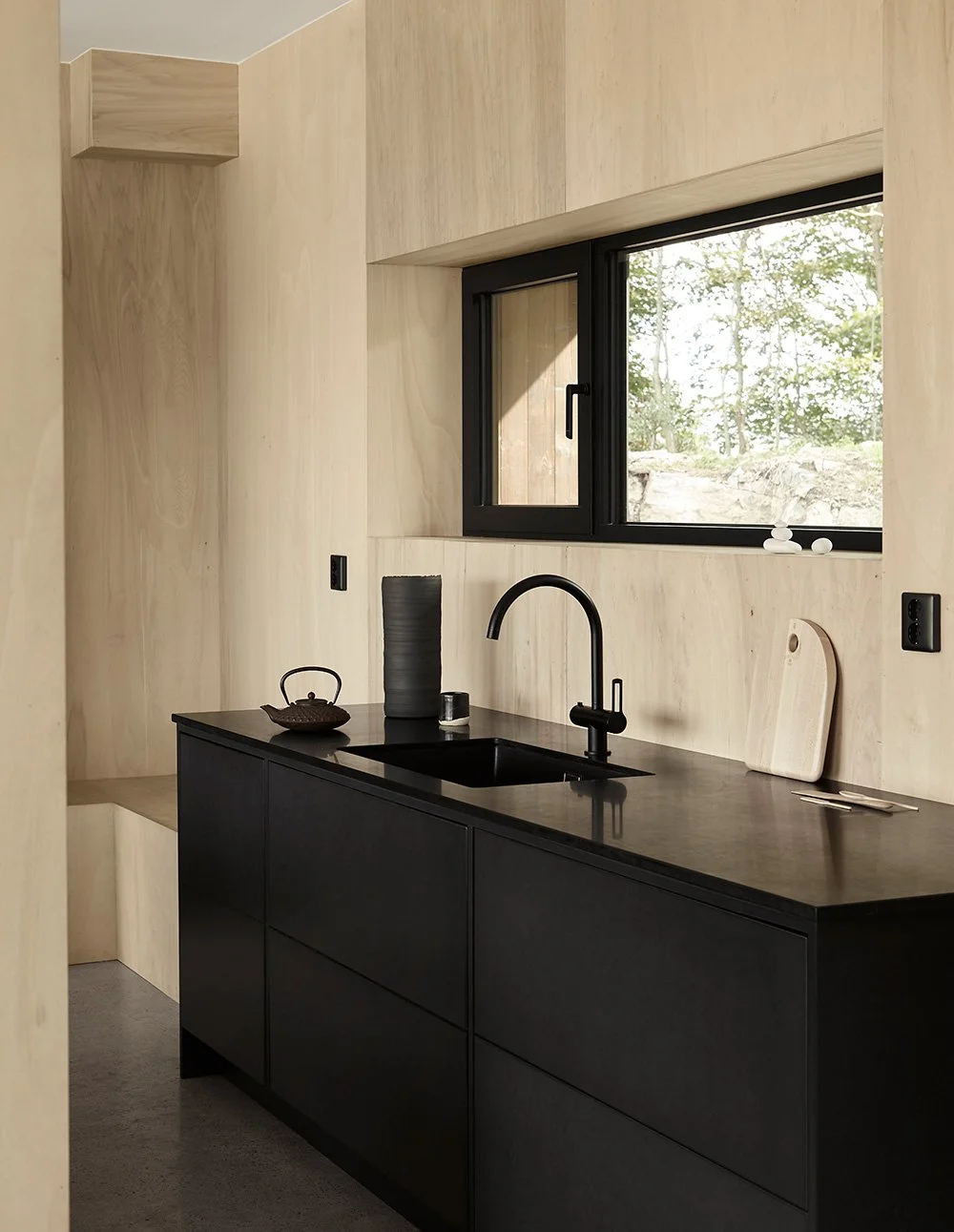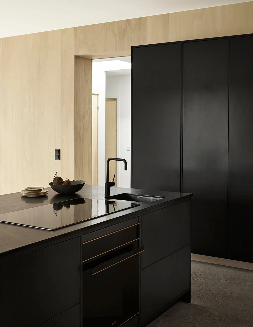 Naturmaterial som betong och trä gör sig bra i ett svart kök och skapar en mjukare känsla.
