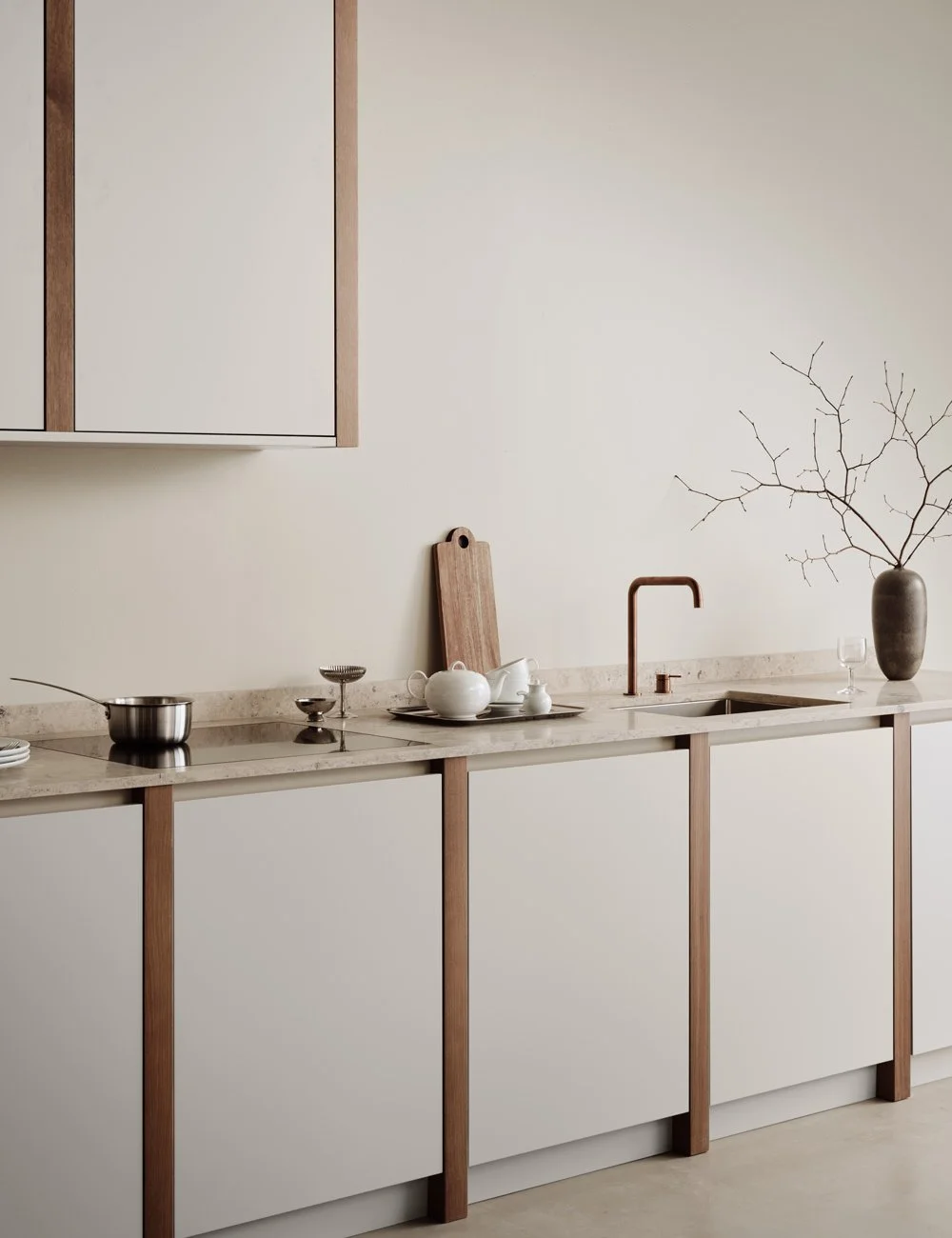 Japandi präglas av naturmaterial, som trä, sten och keramik. Ett kök i japandi-stil, där tonerna går ton i ton skapar en enhetlig känsla och lyfter den traditionella japanska designen. Genom att kombinera olika naturmaterial skapas ett kök som är funktionellt men samtidigt bidrar till lugn och välbefinnande.