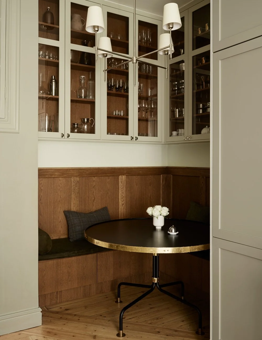 Bistrohörnan med platsbyggd kökssoffa och vitrinskåp hämtar inspiration från fransk bistro. Läs mer om kök i bistro-stil.