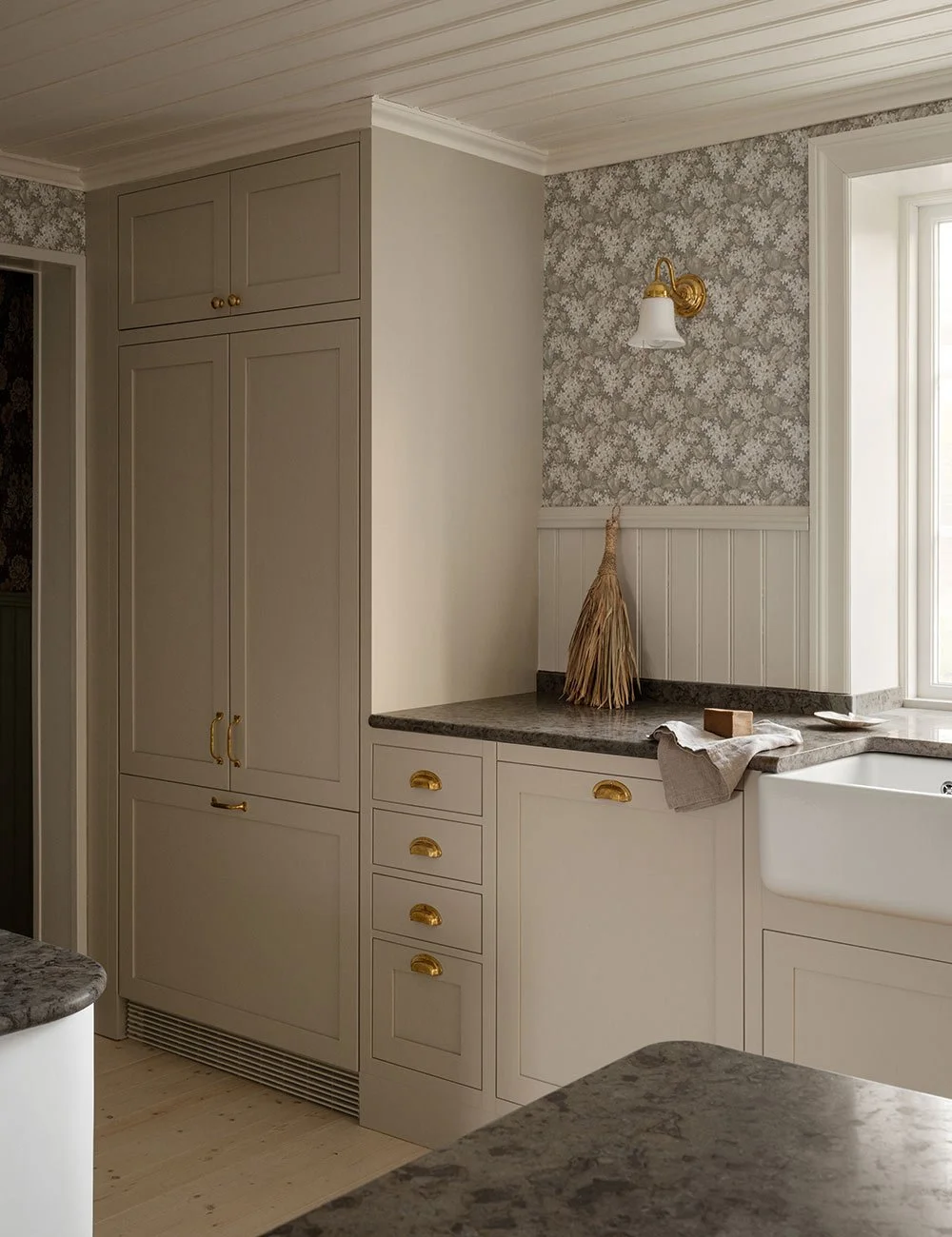 Ett platsbyggt kök i lantlig stil blev det självklara valet för paret. Köket, som är byggt i massivt trä är handmålat på plats och går i en behaglig ljusbeige kulör. Klassiska och tidstypiska detaljer som skålhandtag och porslinsho integreras på ett naturligt sätt i köket.