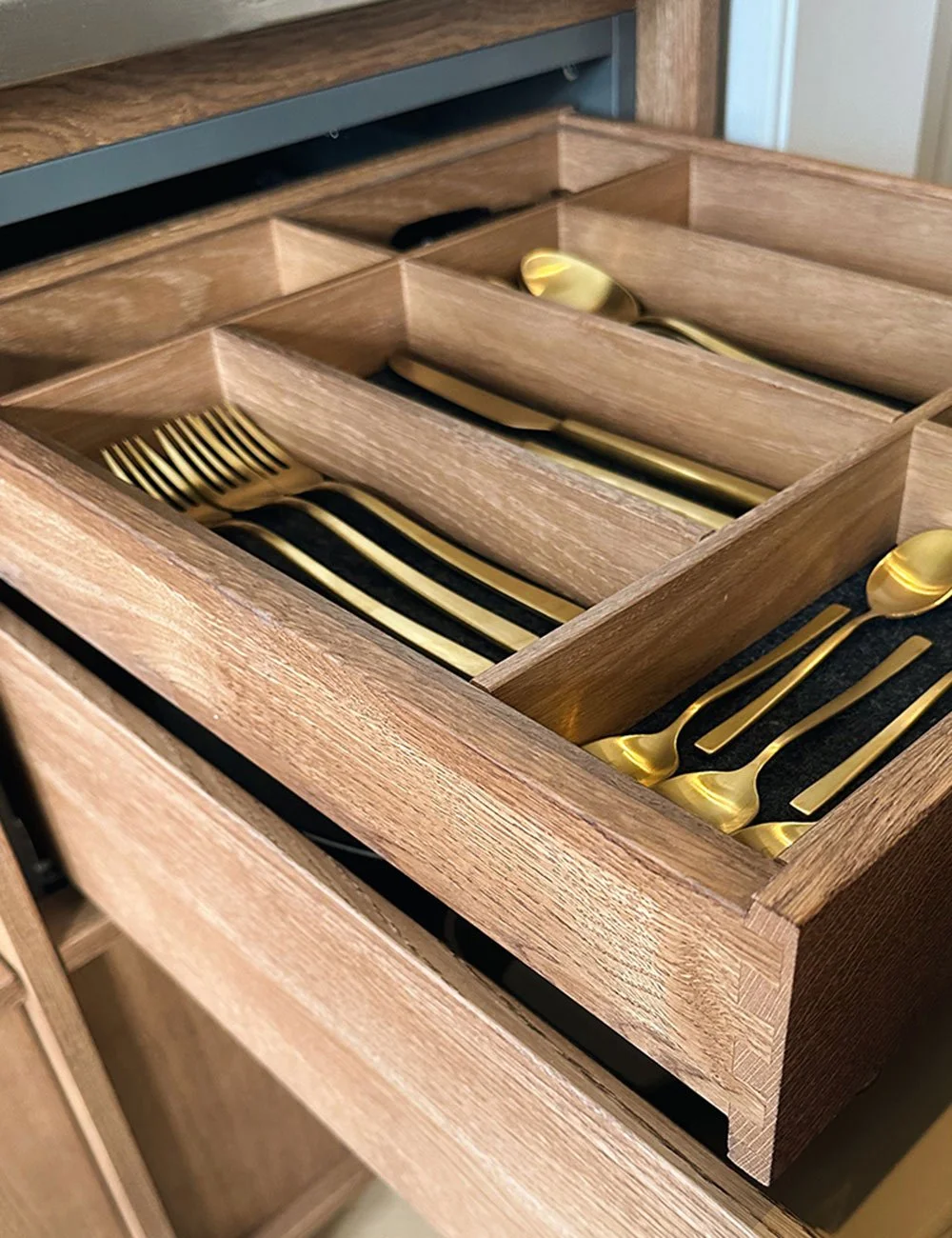 Paret valde massiva trälådor för att ytterligare förhöja känslan och uttrycket i köket.