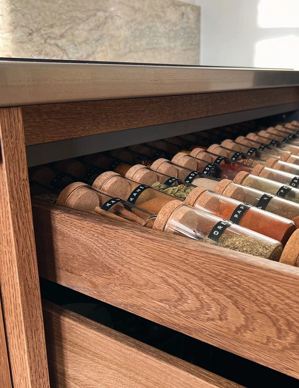 Kärleken till matlagning syns i kryddlådans omfång och uppmärkning.