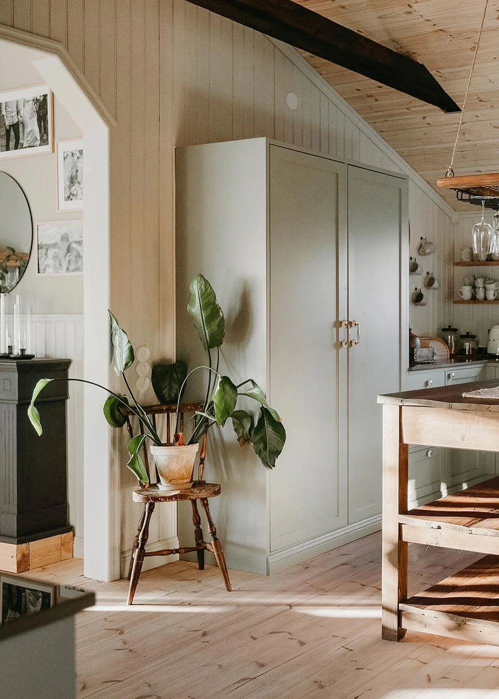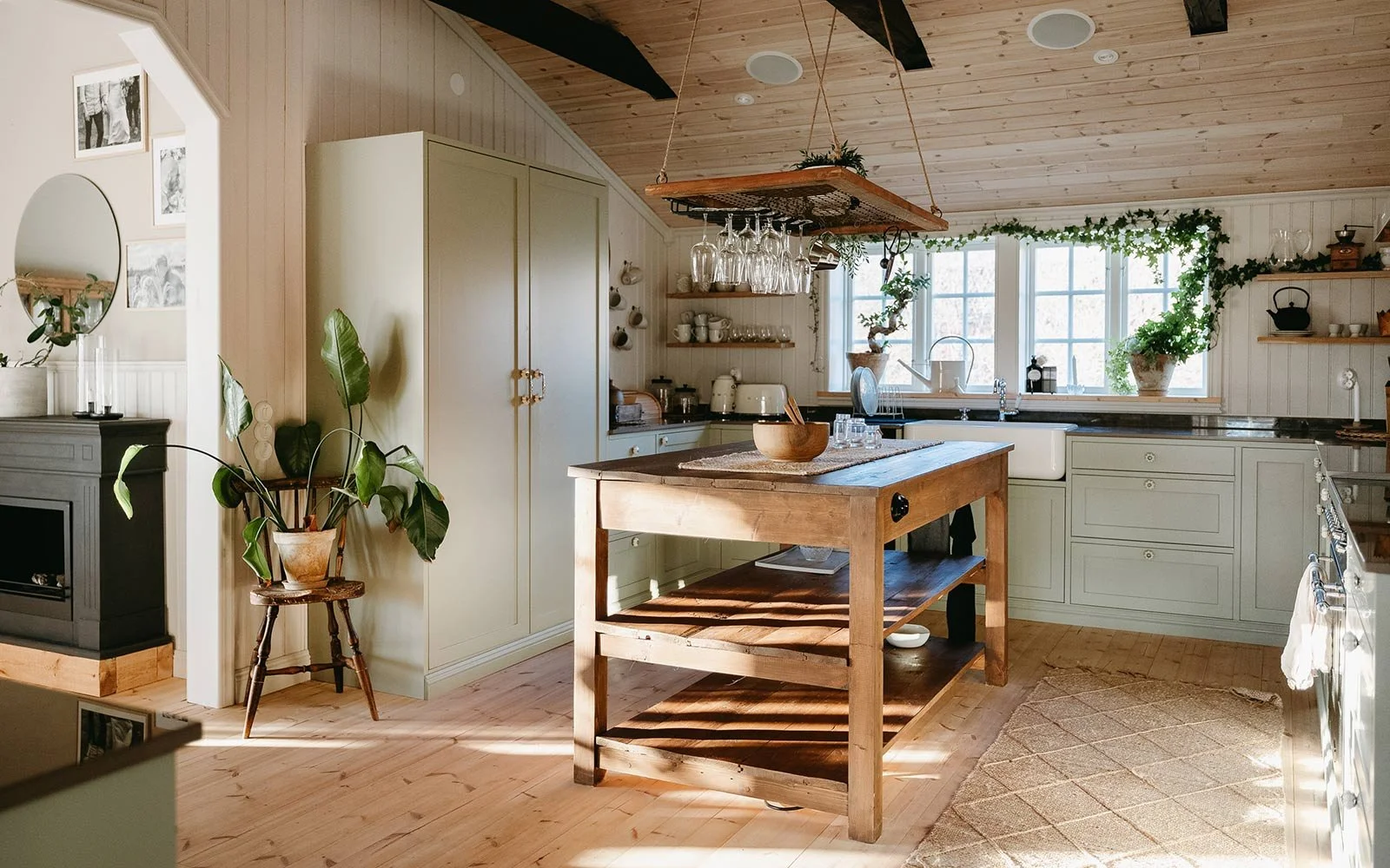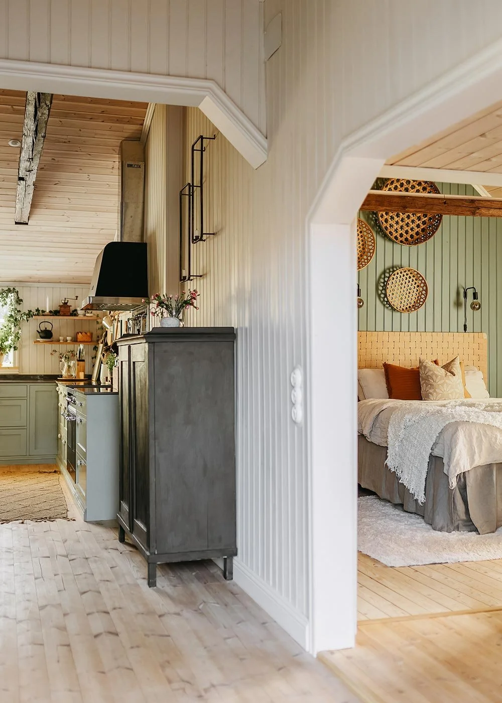 Takbjälkar i taket och pärlspont på väggarna skapar en lantlig atmosfär.