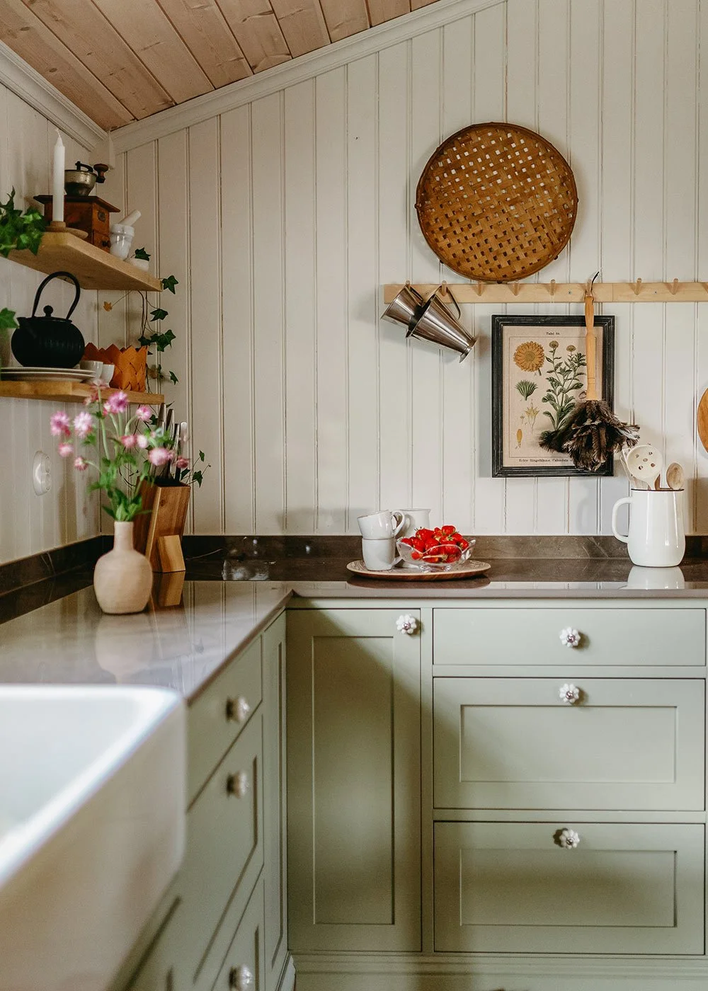 Huset var i stort behov av renovering och valet av kök föll på ett lantligt Shakerkök. Det vackra gröna köket möter både deras vardagliga behov men uppfyller även drömmen om en tidlös design, att älska under en lång tid.