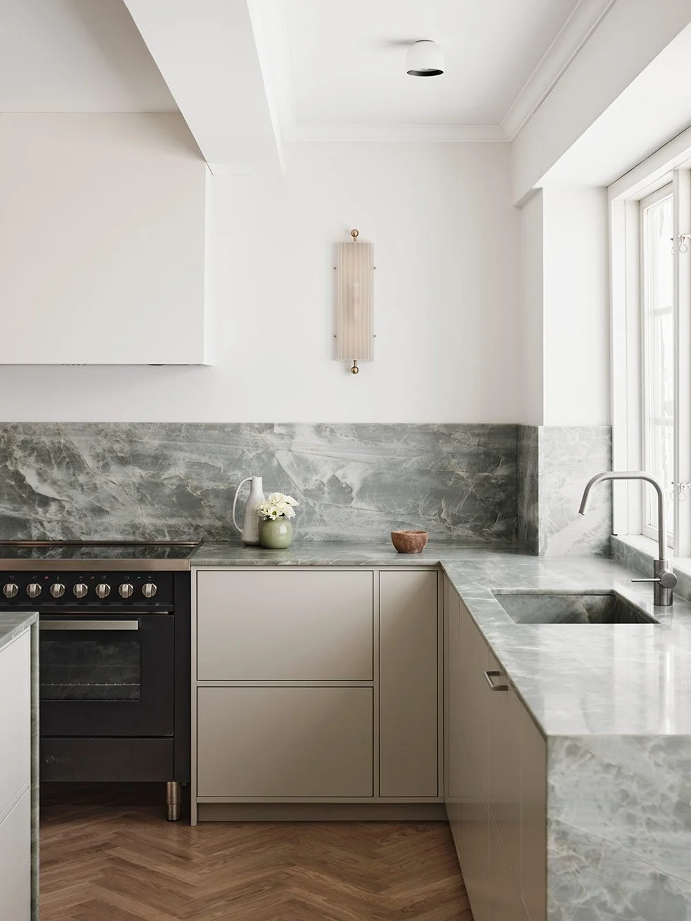 “Luckorna går i stilfullt ljusgreige och kompletteras med tongivande natursten i vackert grön J’adore kvartsit.”