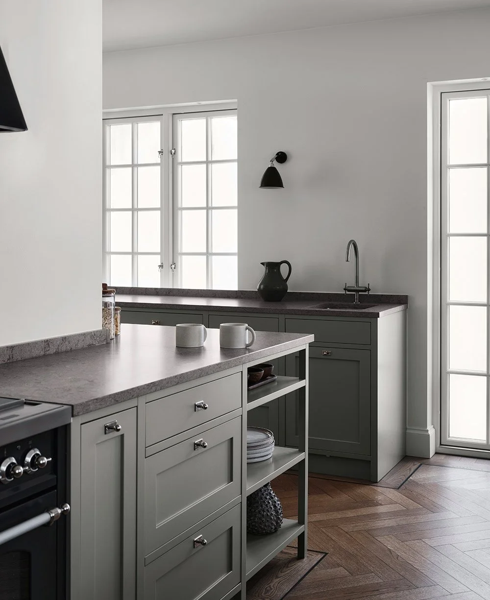 Den beige-grå kulören på skåpsluckorna valdes för att harmonisera med den vackra strandtomten samt husets olivgröna fasad.