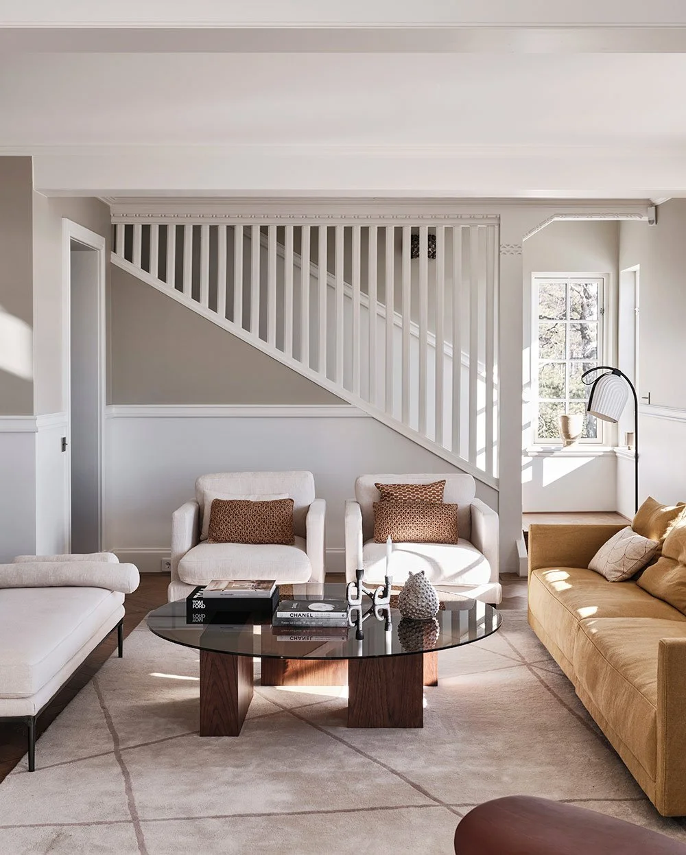 Villa Sand har inte bara ett stort, härligt kök utan även ett generöst vardagsrum. Soffan är från Eilersen, mattan från Layered och fåtöljerna och dagbädden från Ruth & Joanna.