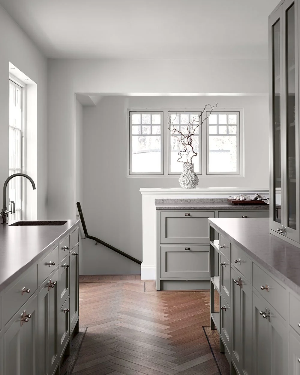 Den yttre delen av köket påminner om en klassisk serveringsgång och det är just den funktionen ytan fyller. Här förvaras allt som hör servering och dukning till. Dessutom finns en praktiskt avställningsyta för olika typer av förberedelser av maten. Vackert trägolv från Chevron Parquet.