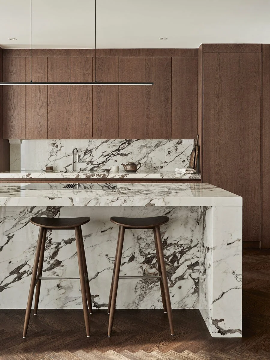 Barstolarna runt den vackra köksön är Icha Bar Stool, Massproductions.