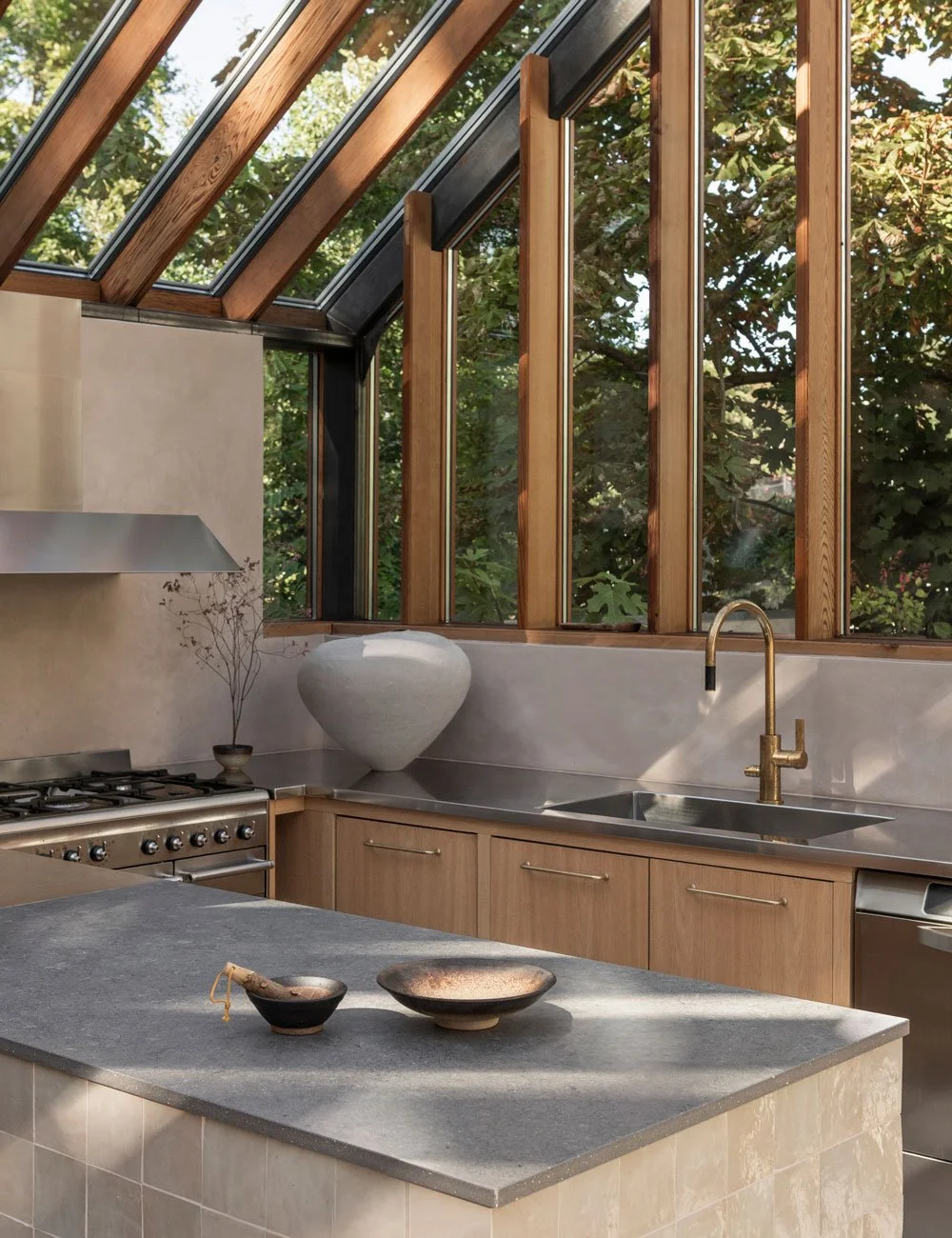 På ena kortsidan av orangeriet står köket. Platsbyggt i ek med rostfria detaljer av Nordiska Kök, förenar det japansk estetik med skandinavisk funktionalitet, och en nypa fransk elegans.