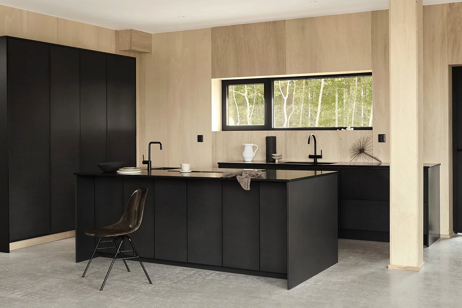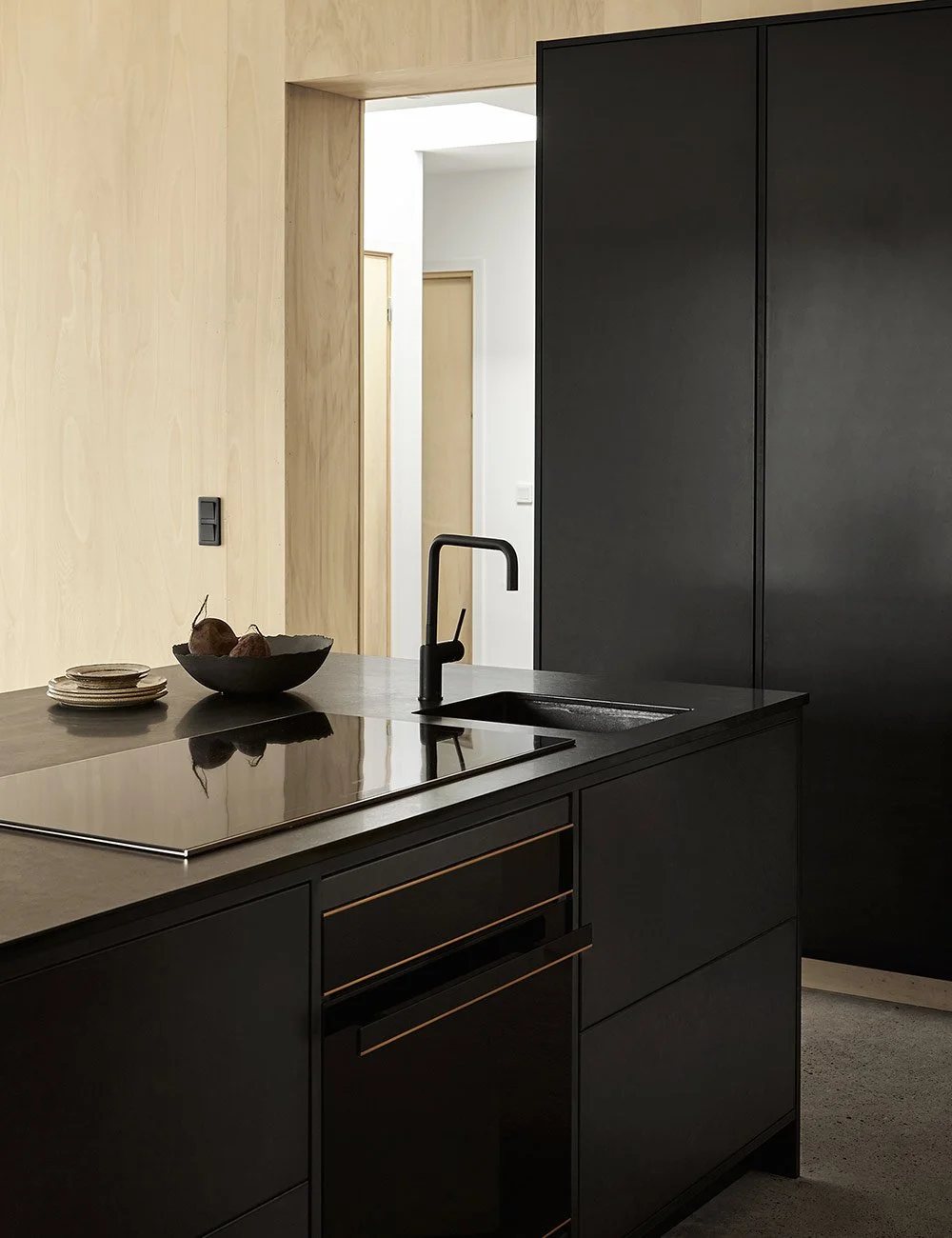 Köket är helt i svart med en matt bänkskiva av granit och luckor i valchromat. Linjerna är raka och lite vassa och skapar ett stramt och sofistikerat intryck. Dessutom är allt utfört med stor elegans och hantverkshöjd – hoarna sitter monterade under en mjuk rundning i stenen, mellan valchromatluckorna finns en vacker mattsvart ram och de olika komponenterna som utgör köket utformade för att skapa symmetri och balans. Det tre eleganta svarta kroppar kontrasteras sedan perfekt i ett möte med den varma organiska ådringen i de furuklädda väggarna och golvet i polerad betong.