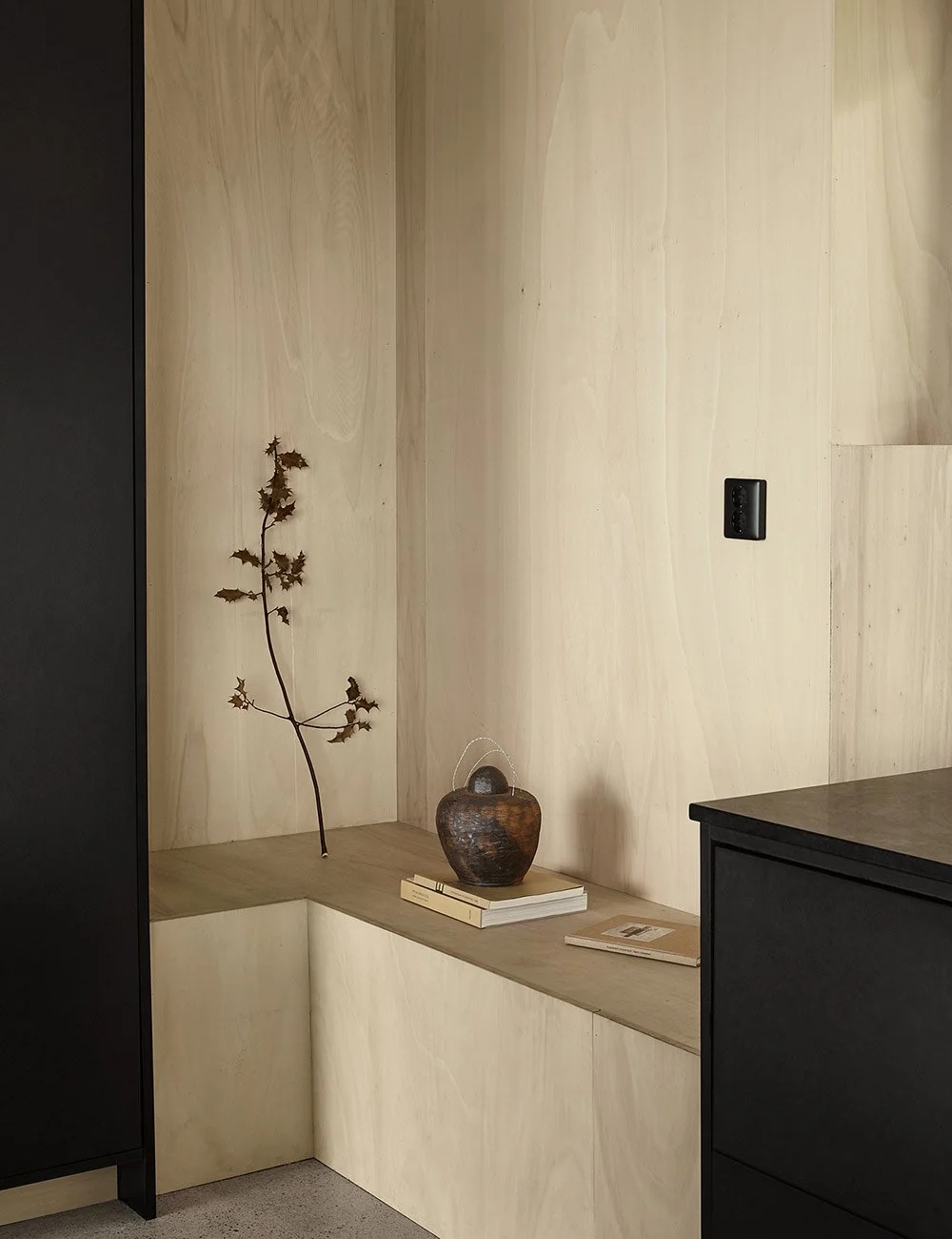 Fönsterkarmen runt fönstret ovan diskbänken är målade i mattsvart och skapar en vacker ram som låter den vackra naturen utanför ta sin välförtjänta plats som ett levande konstverk. Furuskivorna som klär väggarna blir sedan en förläggning av naturen utanför och låter landskapet komma in i köket och fortsätta in i hemmet.