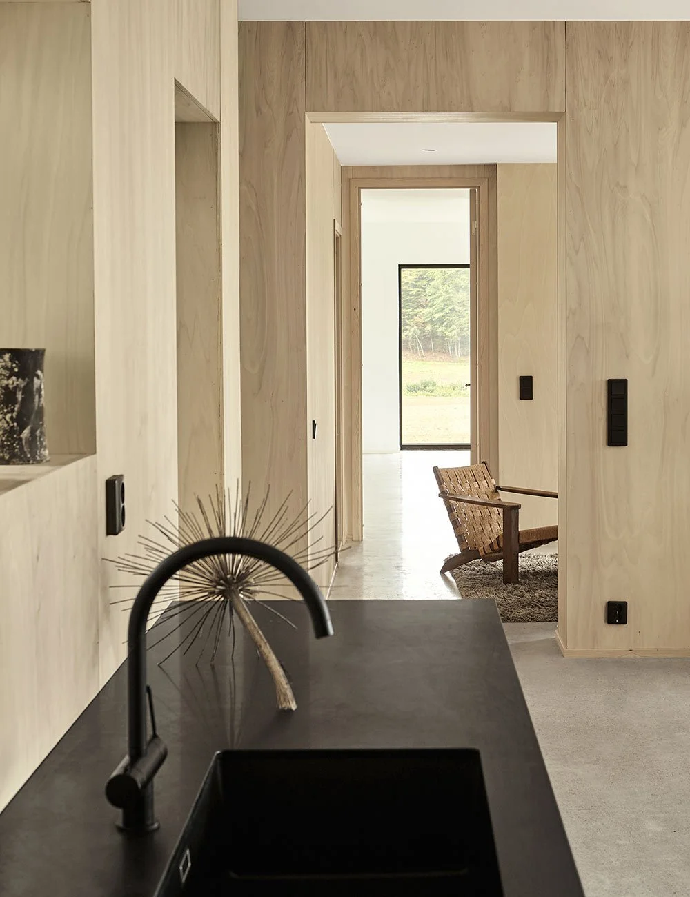 Golvet är i polerad betong och blir en fin fond mot det svarta strama köket och det mjuka furuväggarna.