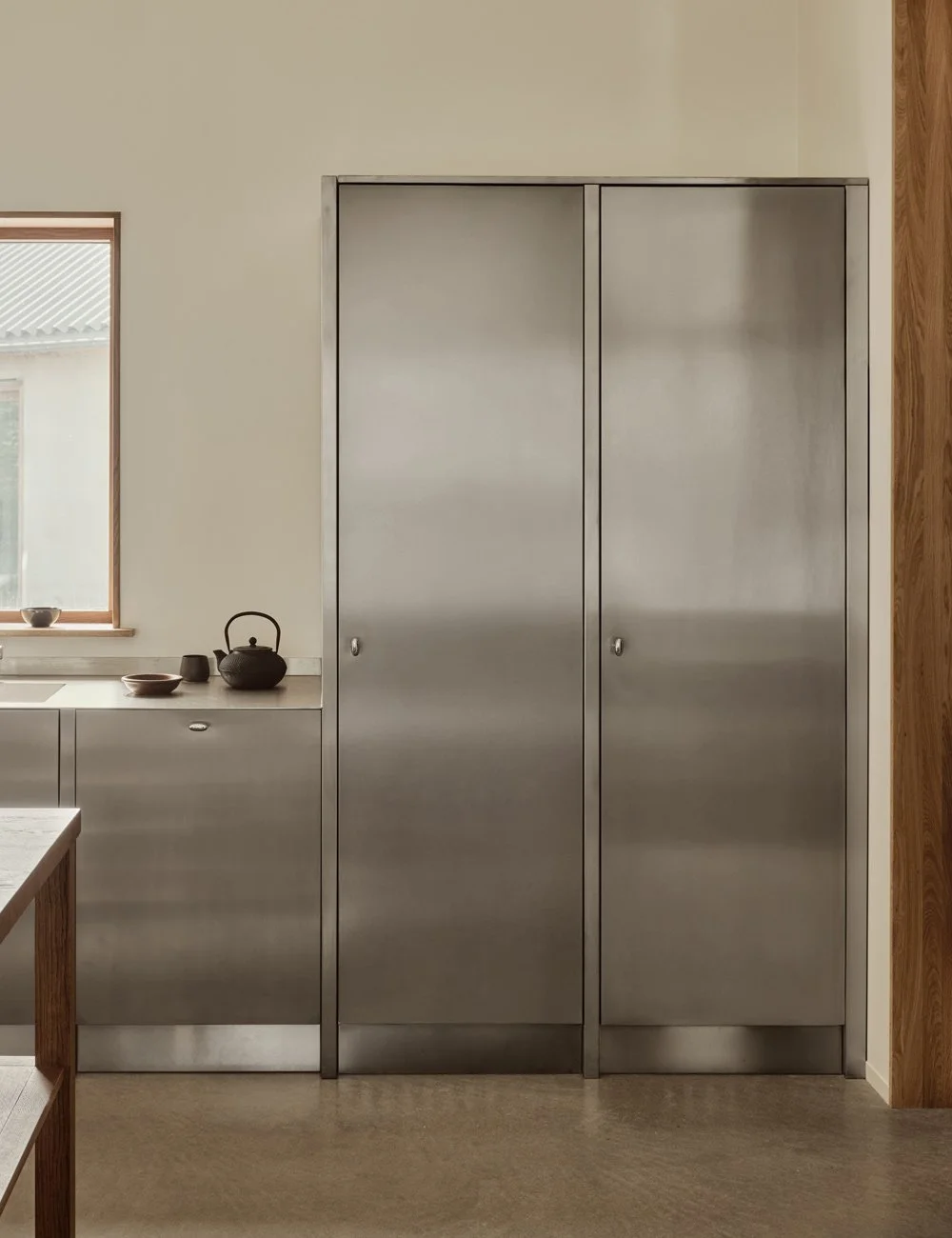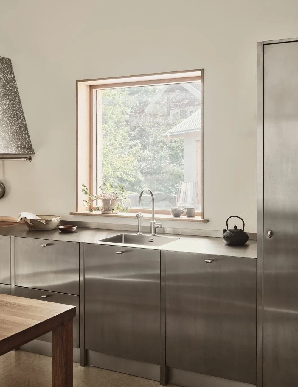 Köket får en modern känsla med rostfria ytor, där både bänkskiva och backsplash också är i rostfritt stål.