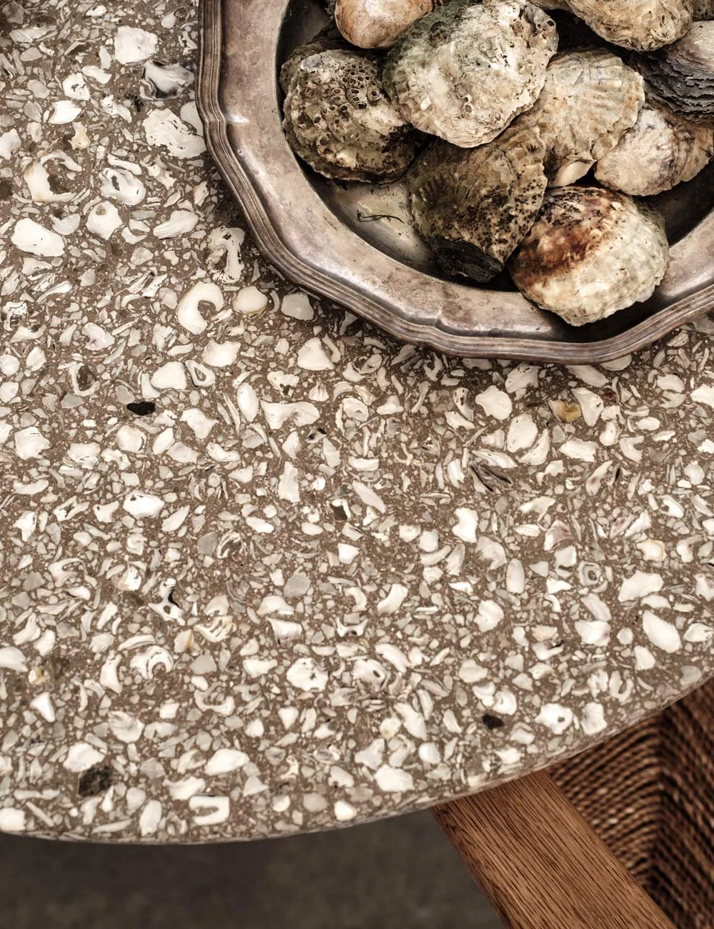 För Lotta var det viktigt att lyfta in ostron som material i huset, något som kompletteras vackert av det rostfria stålet i köket. Ostronskalen återfinns på flera platser på Ostrongården, inte bara invändigt utan också i fasadputsen på tre av de fyra hus som finns på gården.