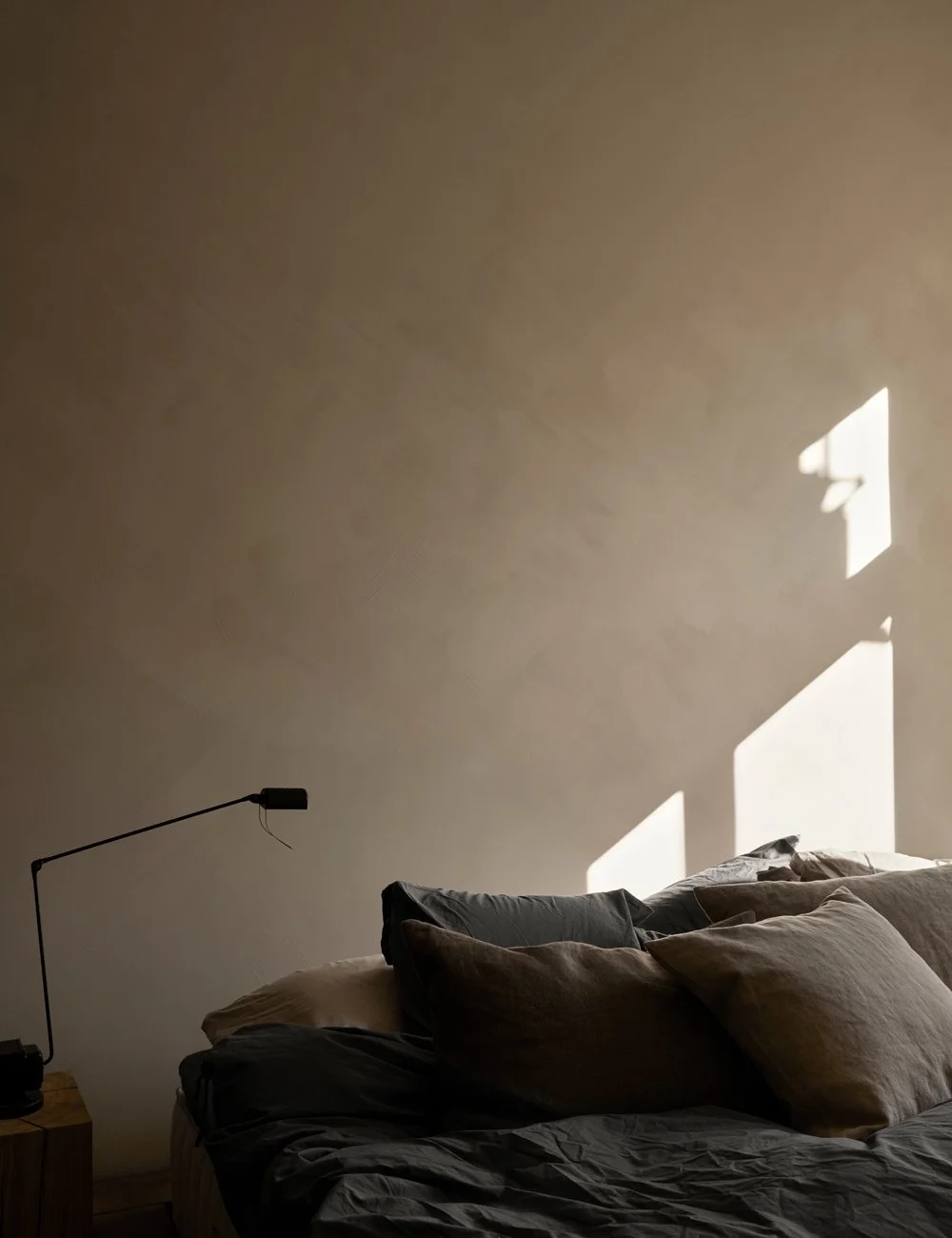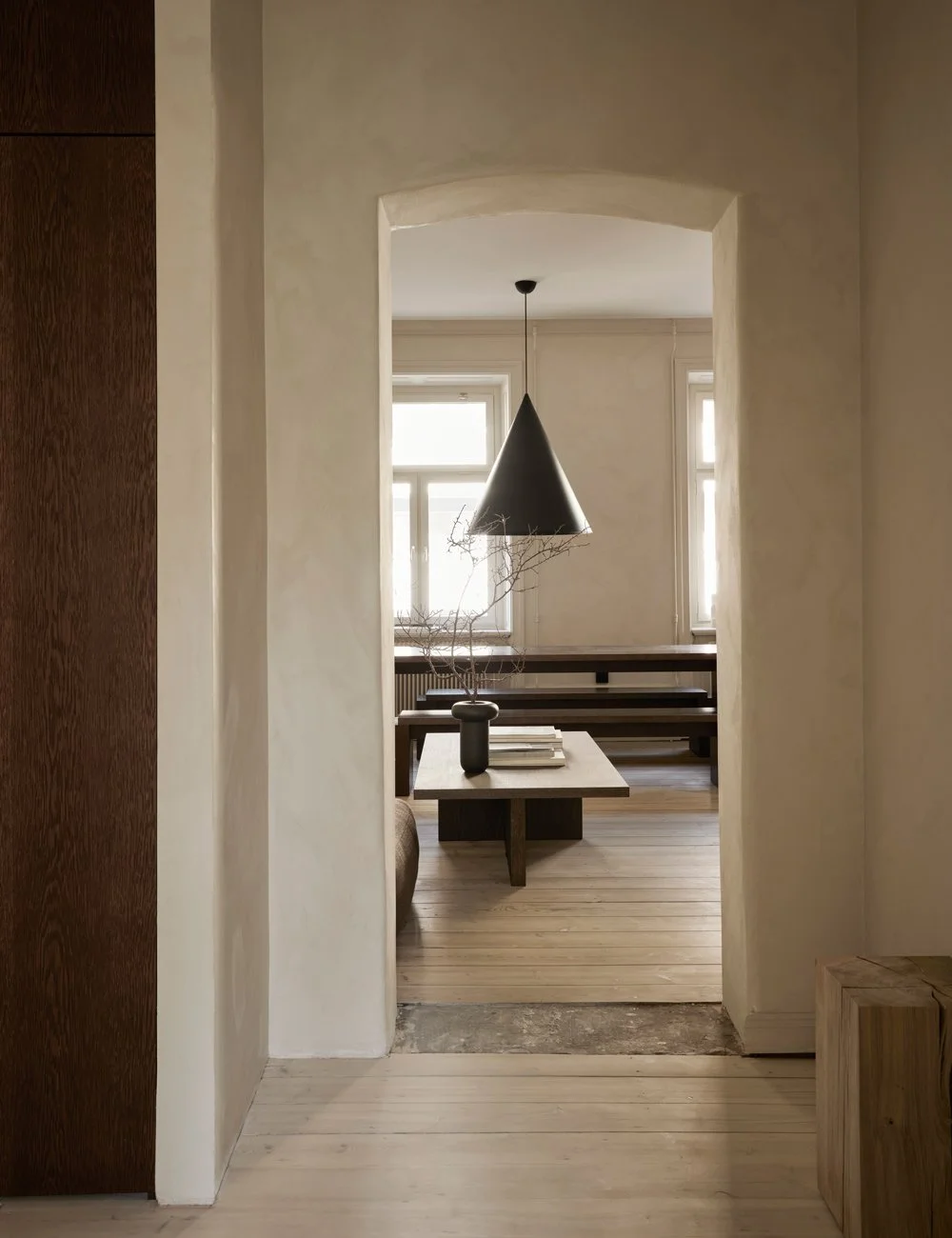 Väggarna i varm beige kalkputs löper genom hela lägenheten och skapar ett enhetligt och harmoniskt intryck.