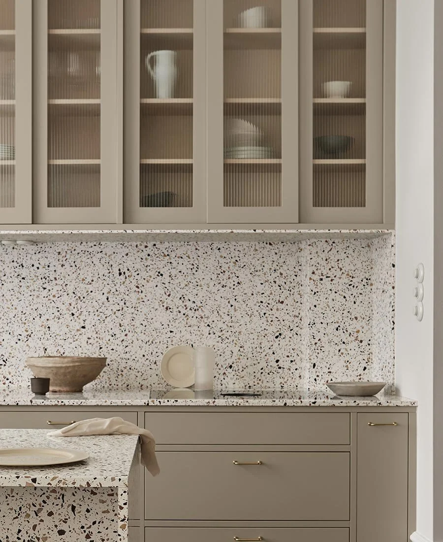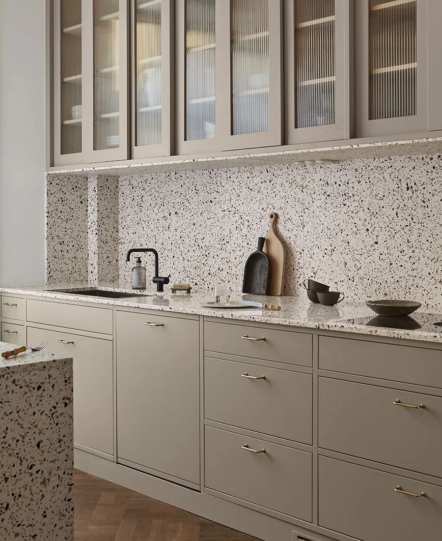 Terrazzo är ett material som är både hållbar och lättskött. Ett vackert och funktionellt val till ett kök som används ofta och där mat gärna lagas tillsammans.