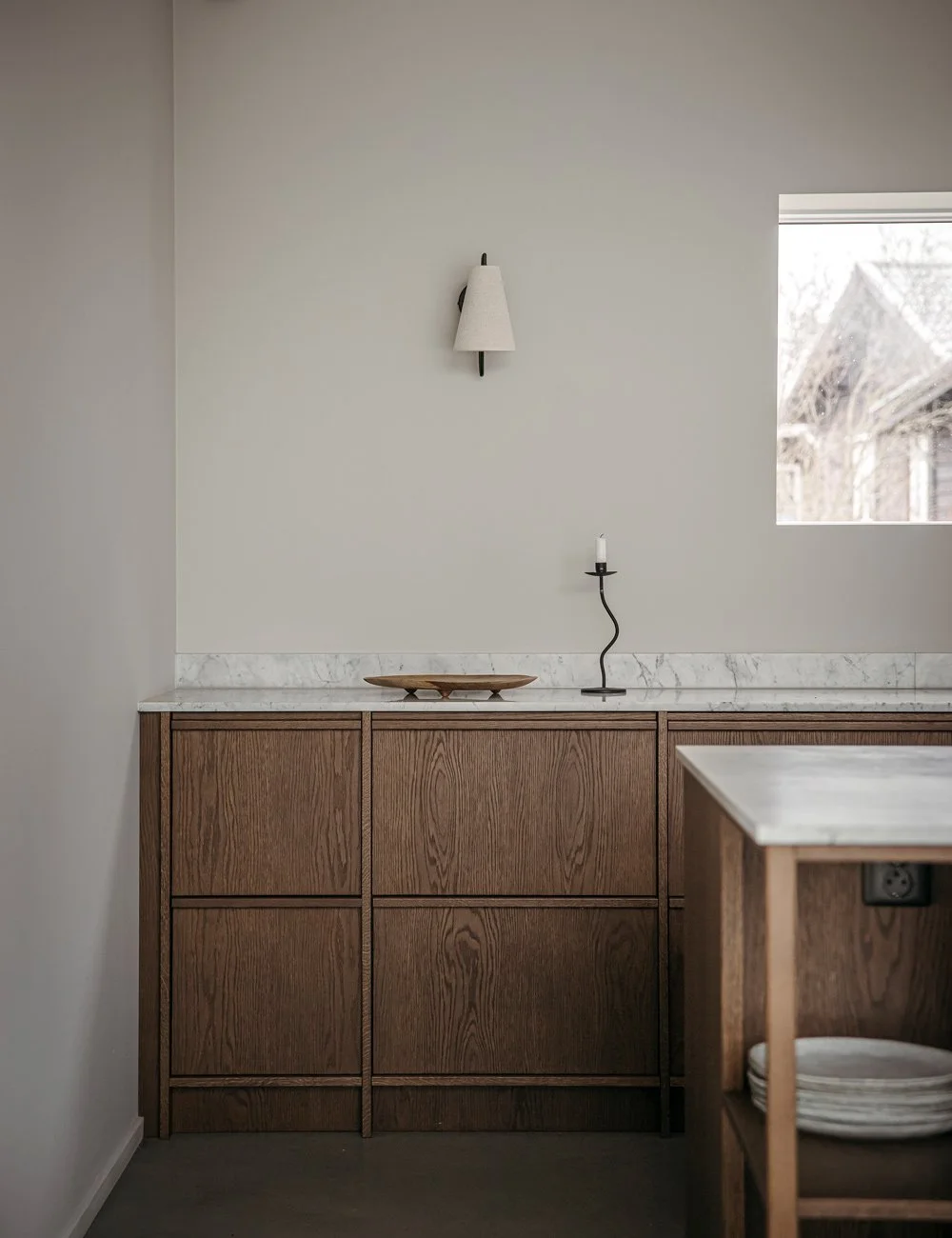 Köket i mörkbetsad ek blandar en skandinavisk och minimalistisk estetik med rustika inslag. Vägglampa från Globen Lighting.